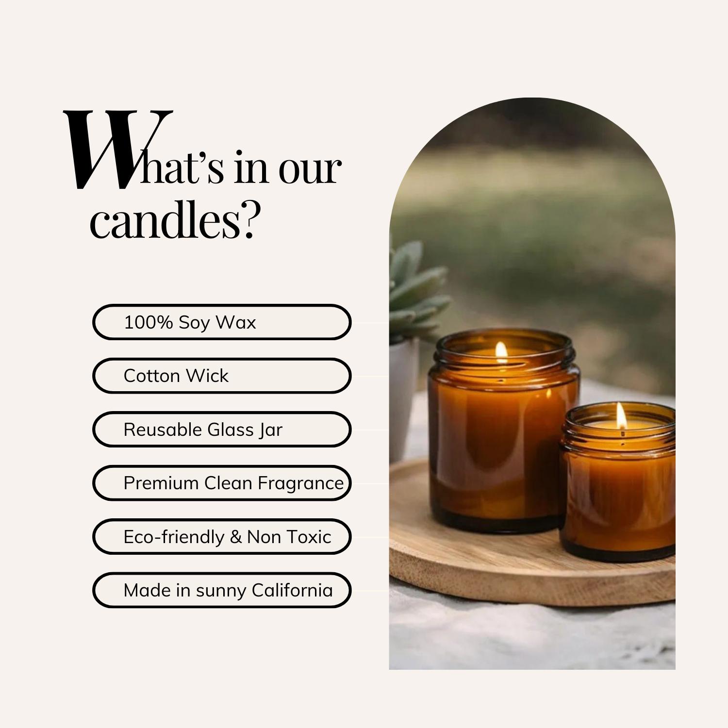 Our candles are free from harmful chemicals and toxins. Made with 100% natural soy wax and a 100% cotton wick for a clean, consistent burn. Each vessel can be cleaned and repurposed as décor or storage after use. Crafted in the USA with globally sourced components and compliant with ASTM safety standards.