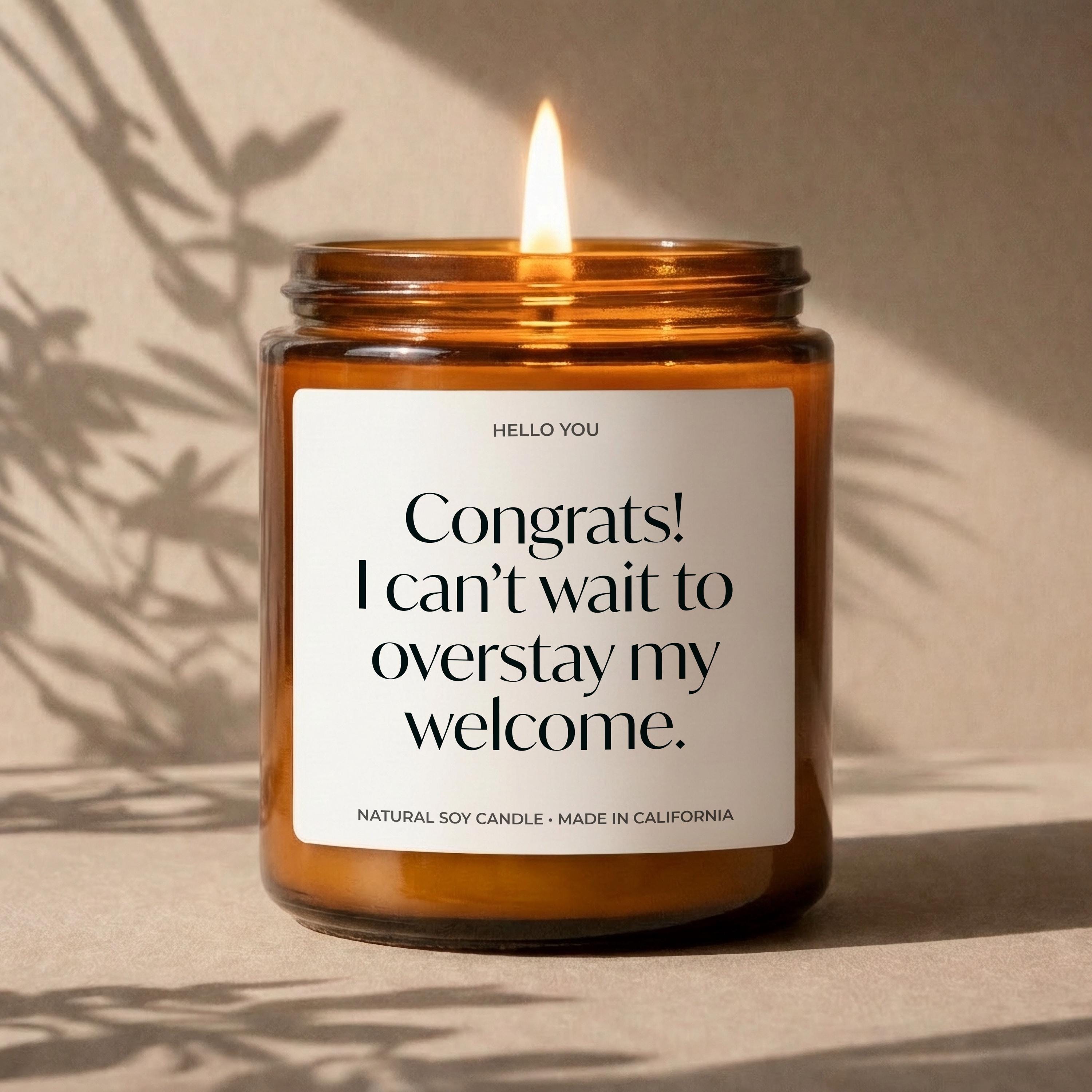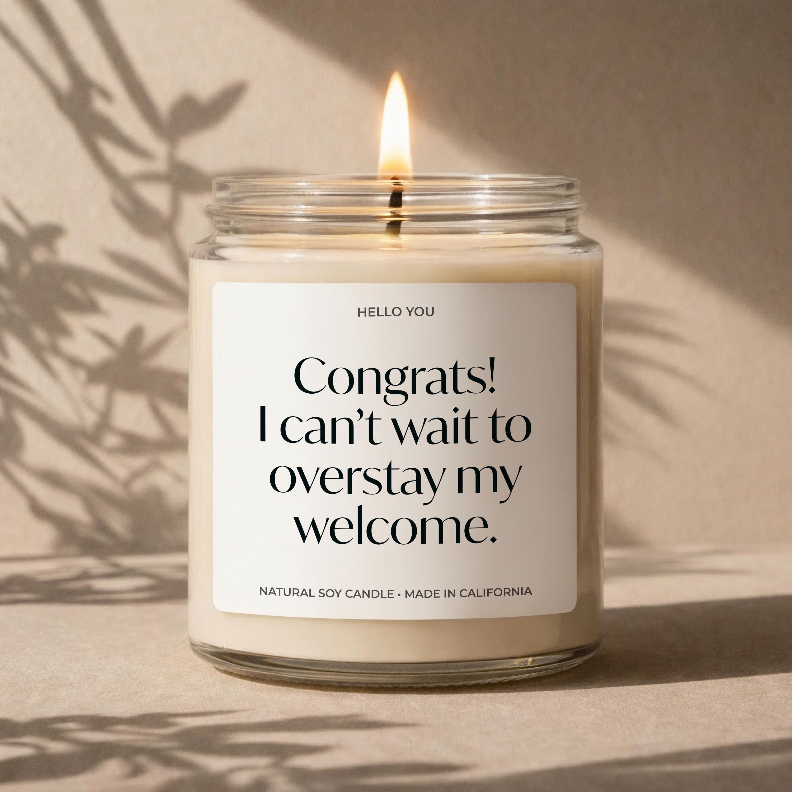 Our Personalized Housewarming Gifts candles read "Congrats, I can't wait to overstay my welcome." and are the perfect new home gifts, new house gifts, neighbor moving gifts, funny candles, personalized candles.