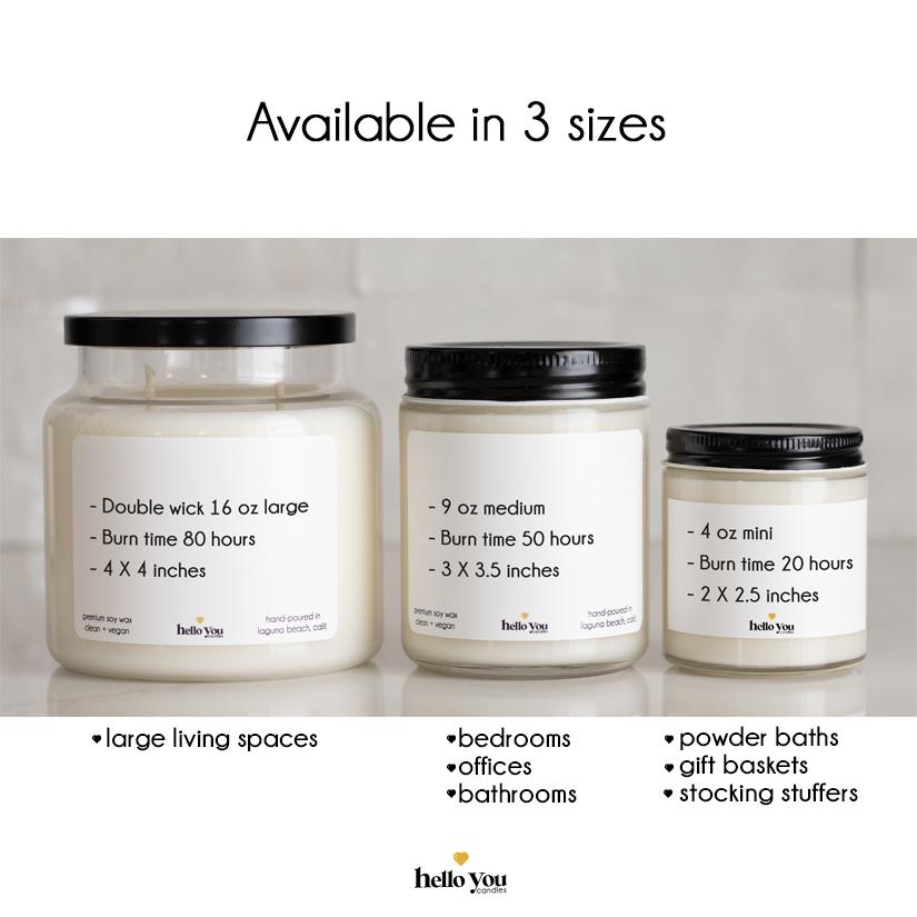 Our candles measure approximately 2.75 inches in diameter and 3.5 inches tall. They are filled with 9 oz of soy wax and have an approximate burn time of 50 hours.