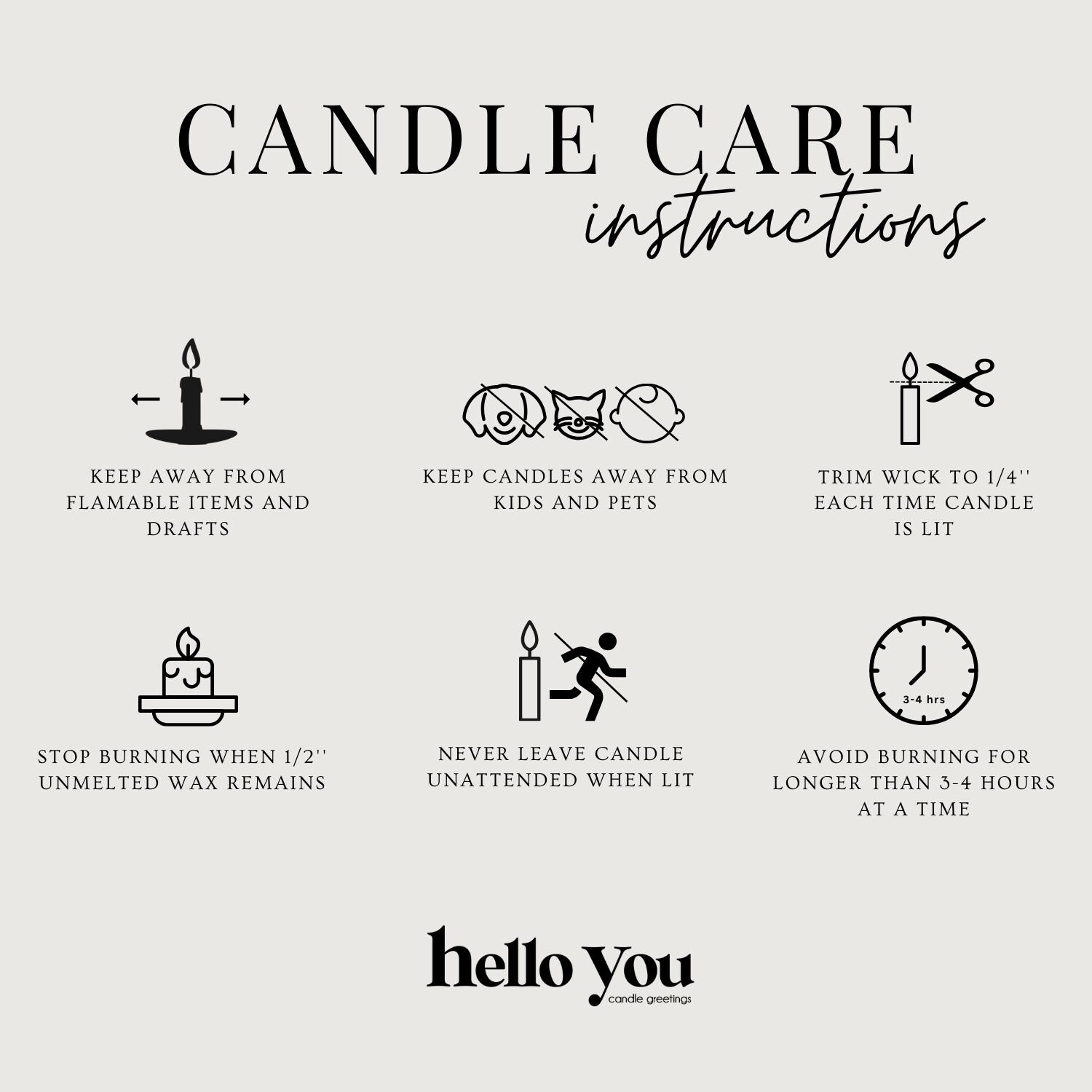 Keep burning candles within sight. Keep away from children and pets. Never burn near flammable items.