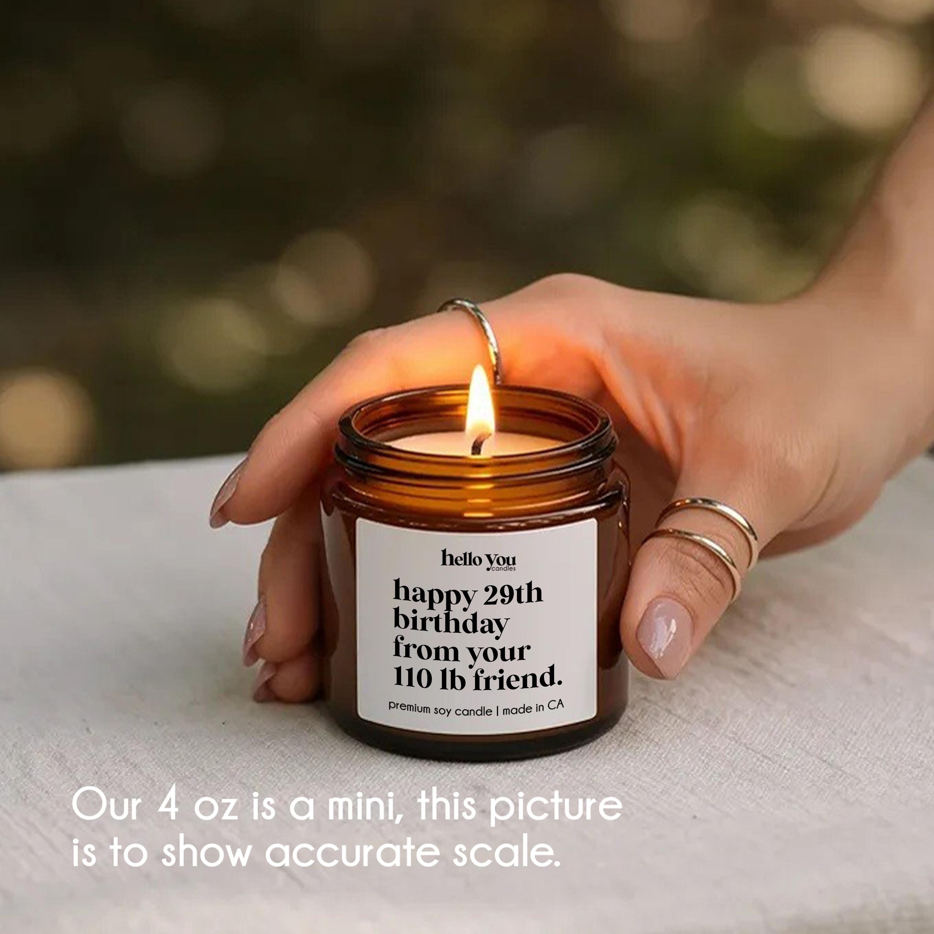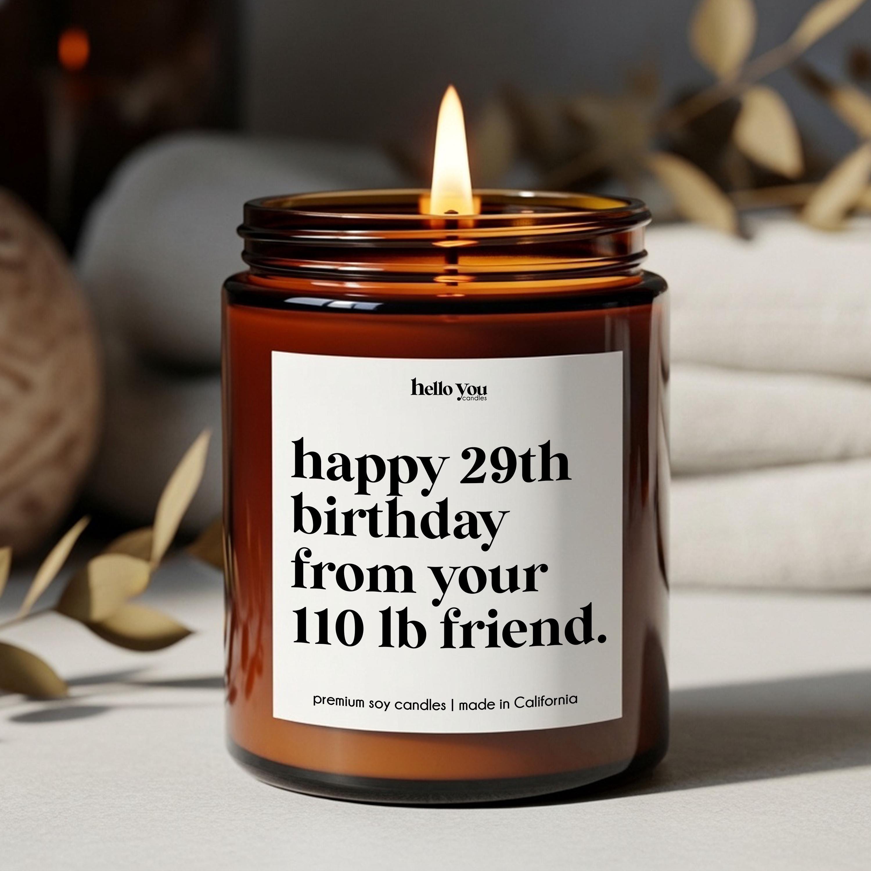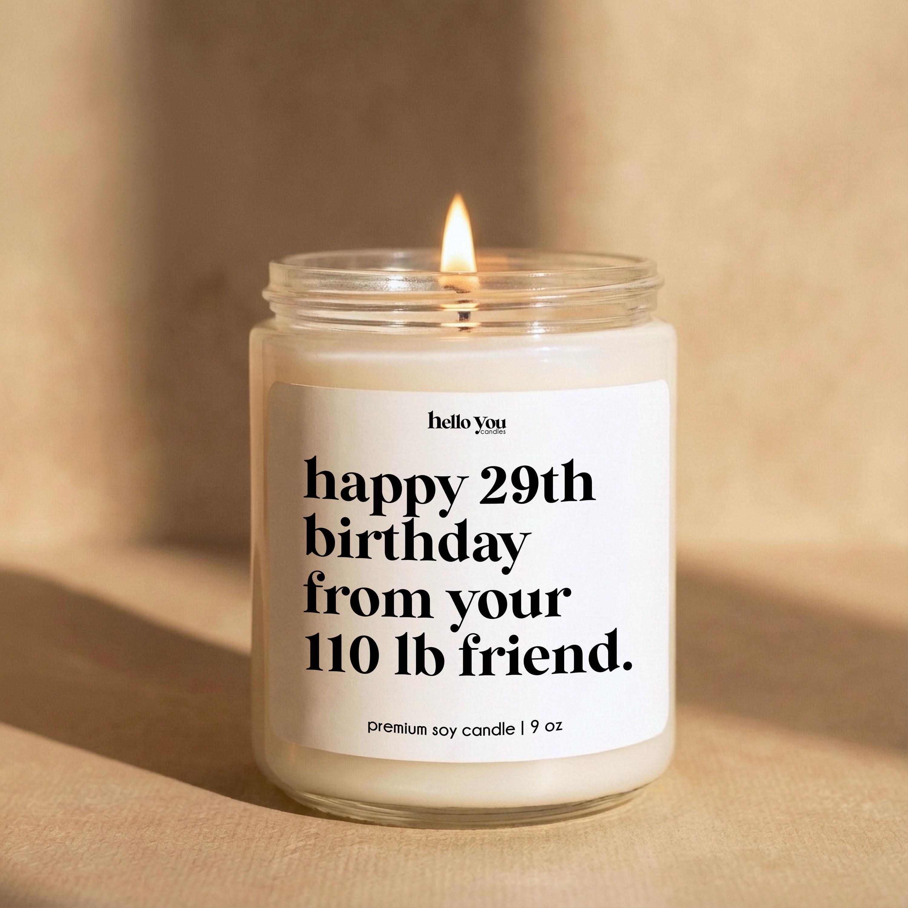 Our Friendship Gifts Candles reads "Happy 29th birthday from your 110 lb. friend" and is the perfect best friend gifts, funny birthday gifts, funny candles, personalized candles, personalized gifts, funny birthday cards.