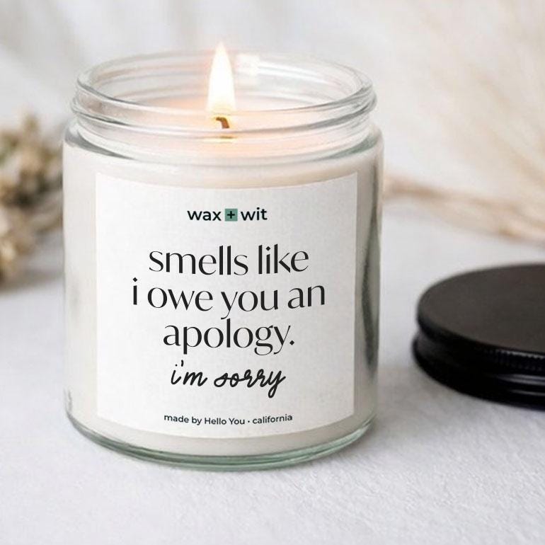 Our apology gift candle reads "Smells like I owe you an apology, I'm sorry." and is the perfect I'm sorry gift for your bestie, work bestie gift, sister gift candle or boyfriend gift.