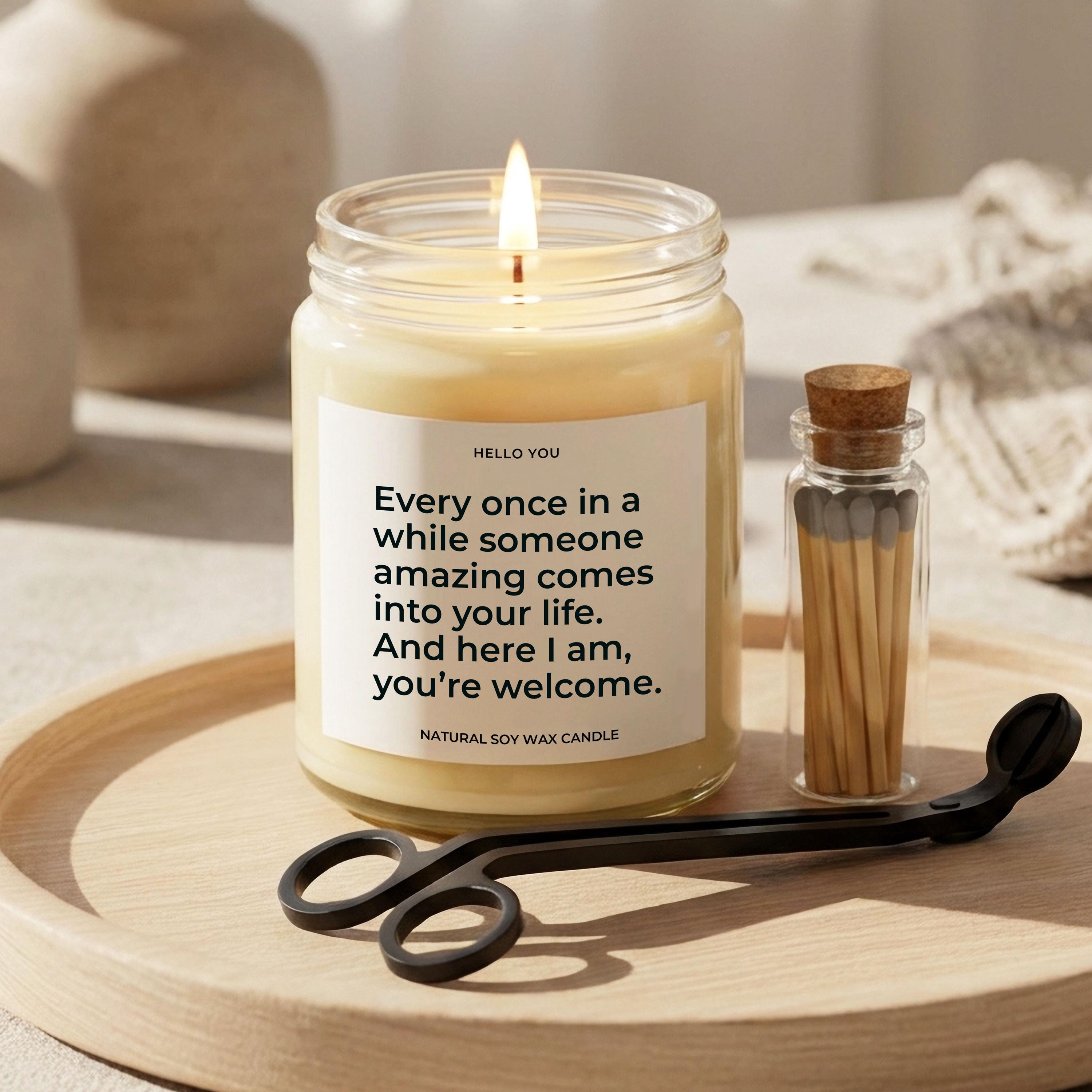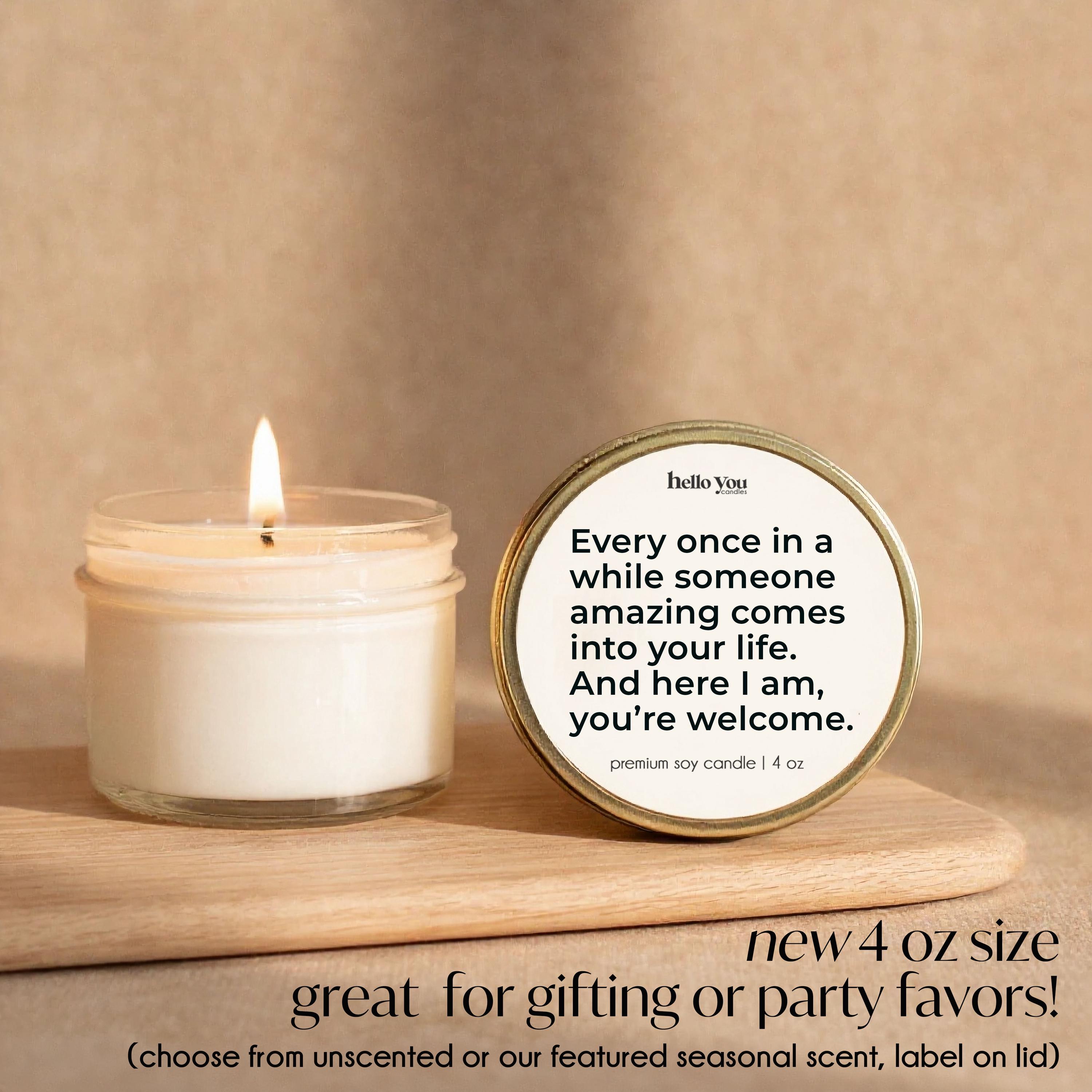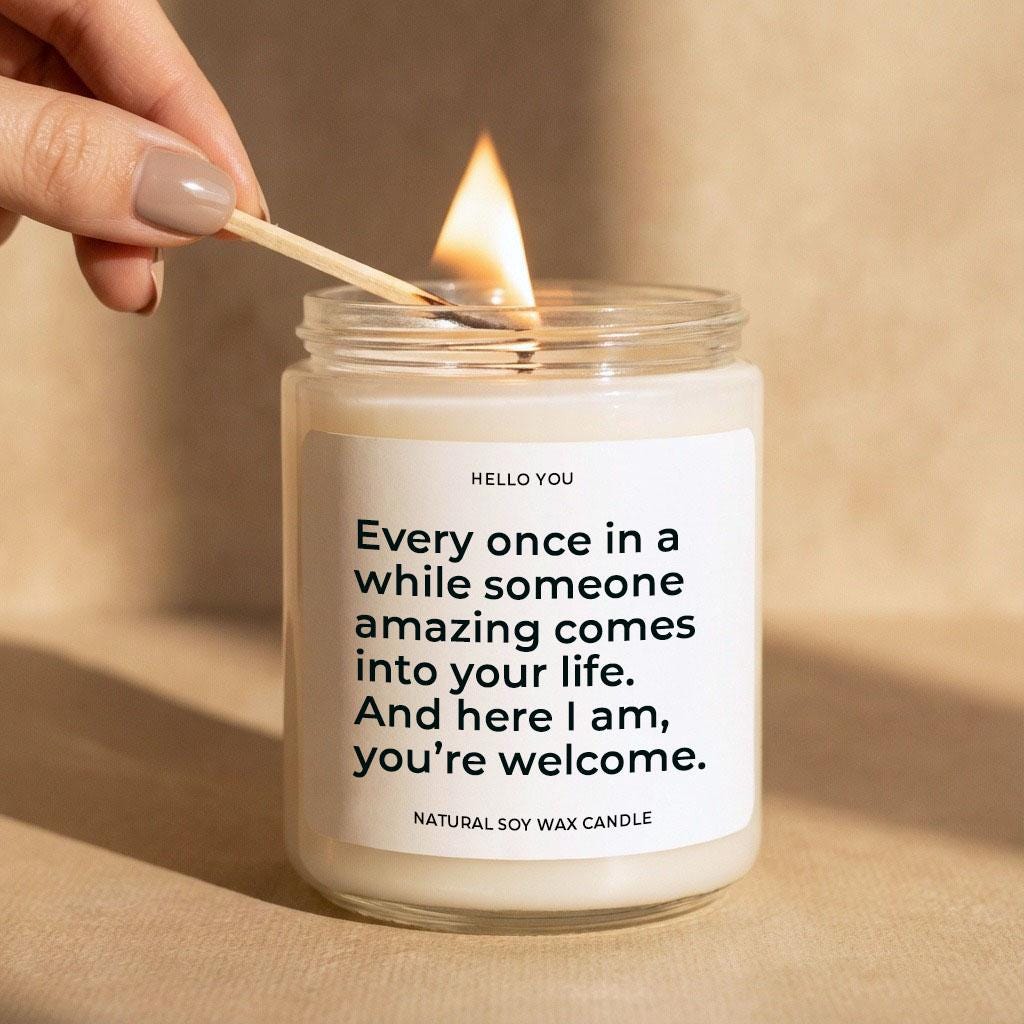 Our personalized best friend gifts candle reads "Every once in a while someone amazing comes into your life and is the perfect best friend candle gifts for friends. And here I am, you're welcome." and is the perfect gift for your bestie, work bestie gifts, gifts for wife candle, boyfriend gifts or friendship gifts.