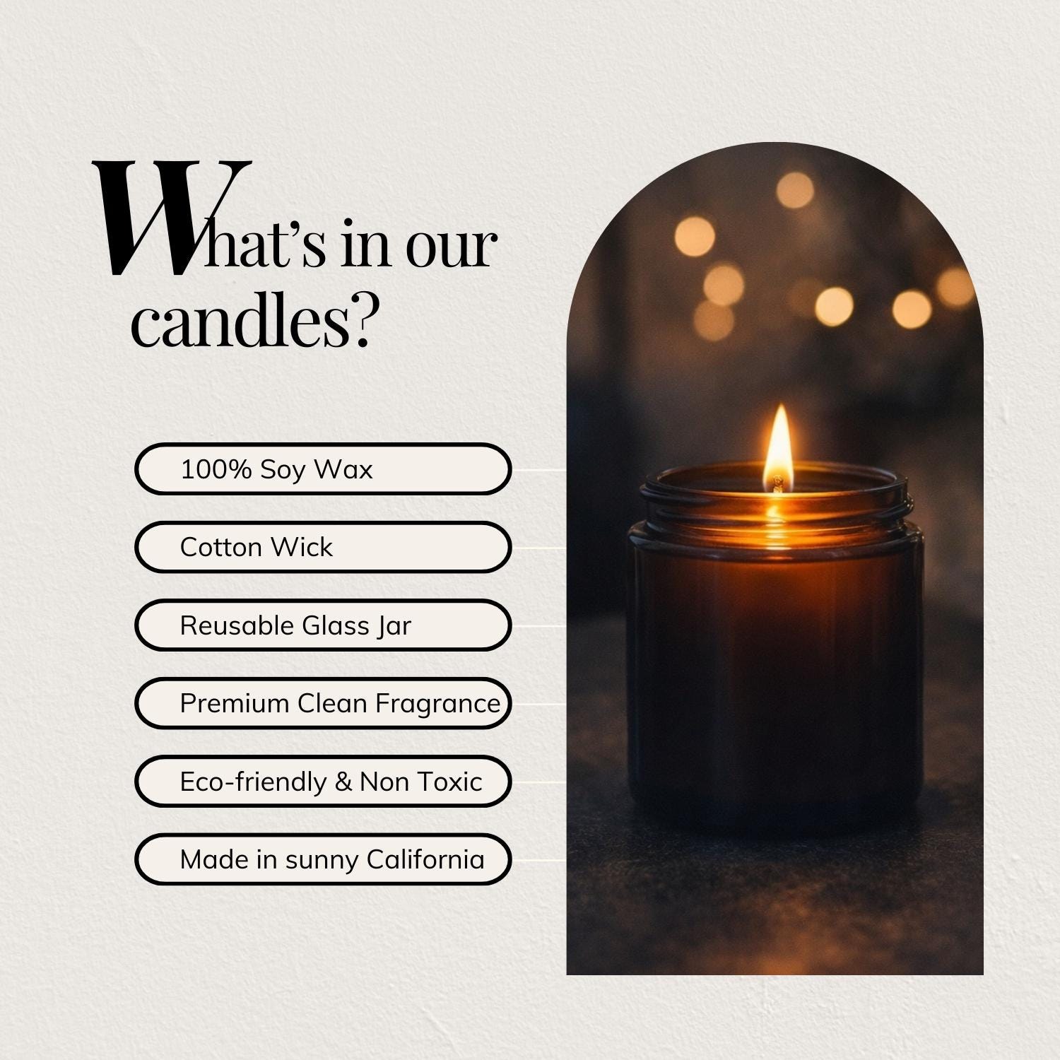 Our candles are free from harmful chemicals and toxins. Made with 100% natural soy wax and a 100% cotton wick for a clean, consistent burn. Each vessel can be cleaned and repurposed as décor or storage after use. Crafted in the USA with globally sourced components and compliant with ASTM safety standards.