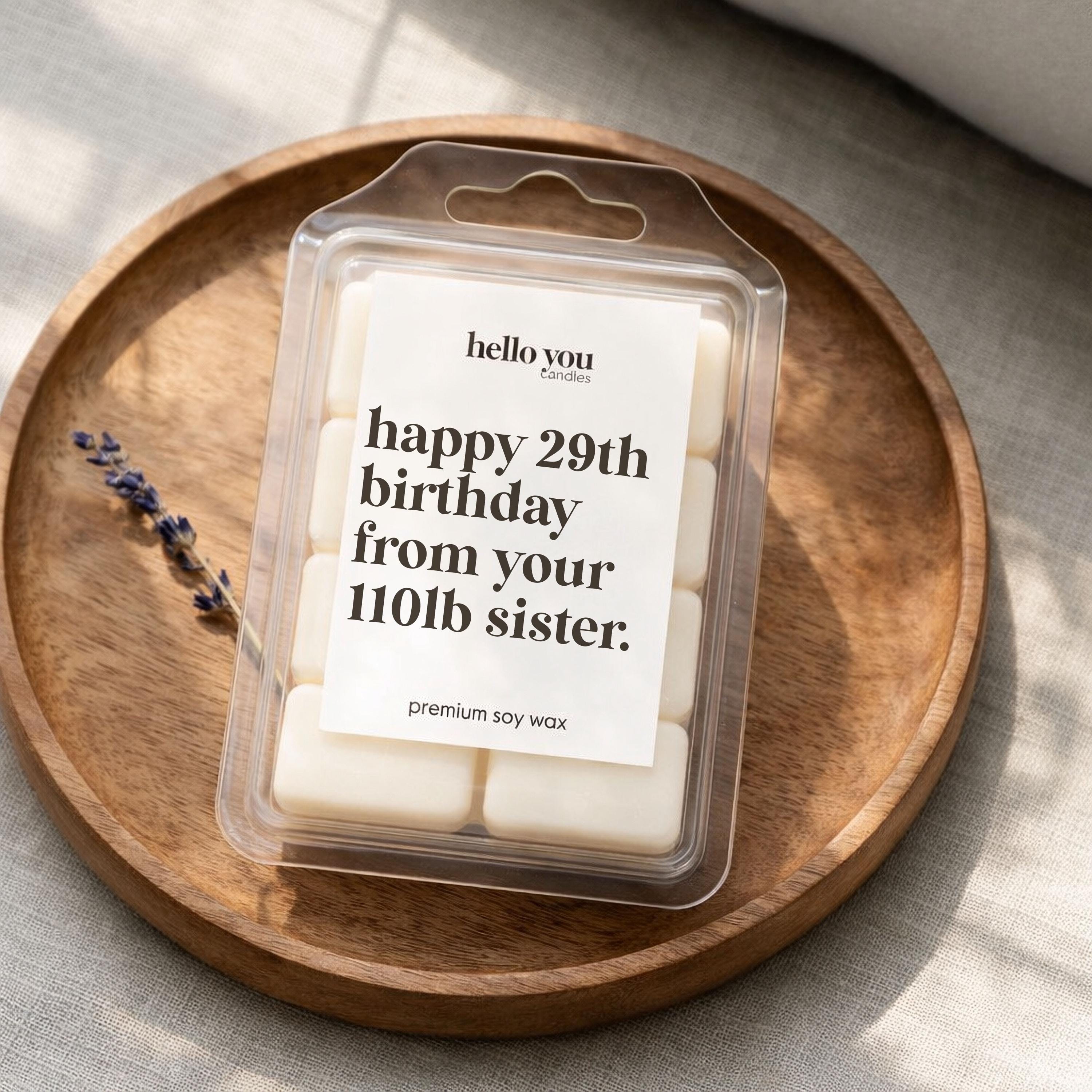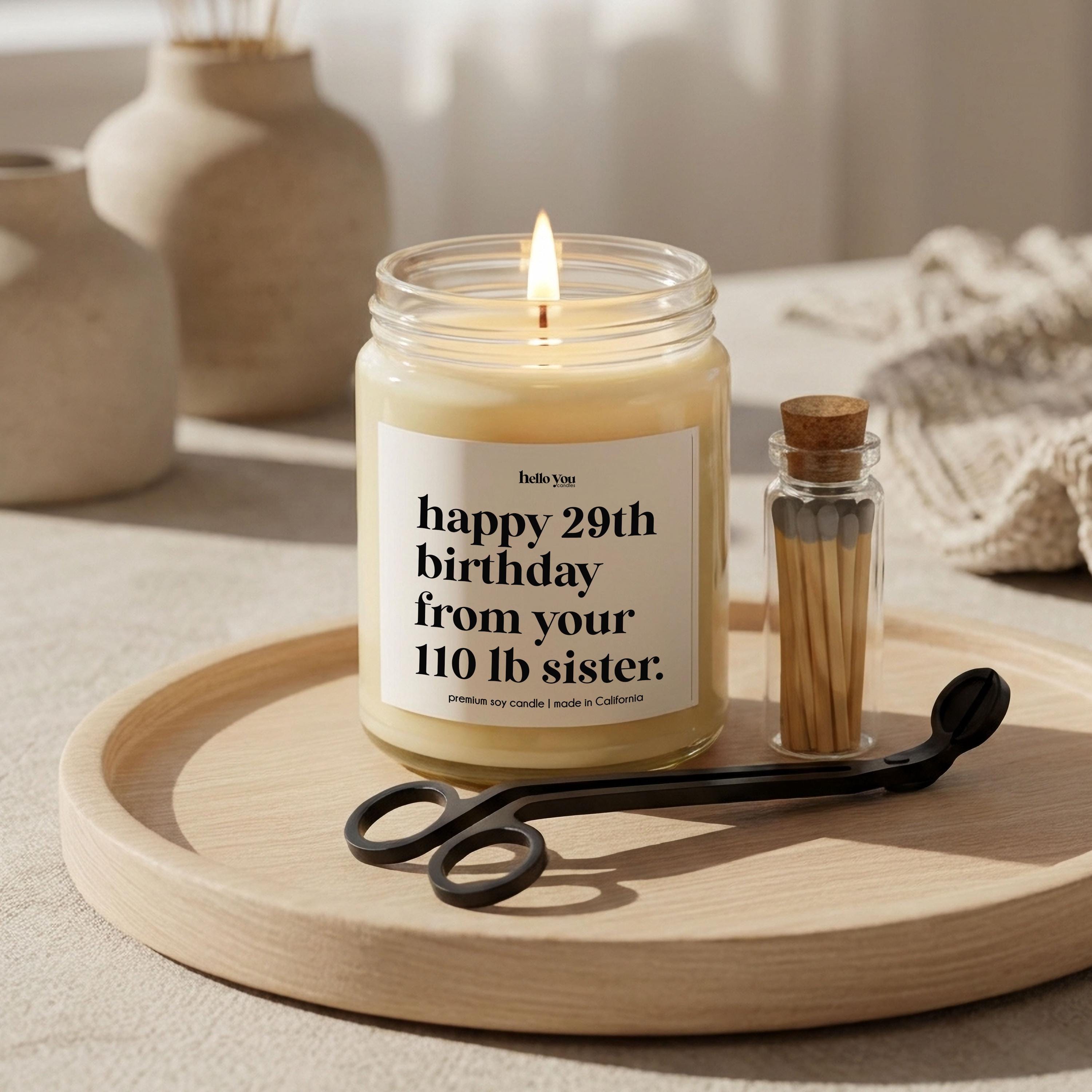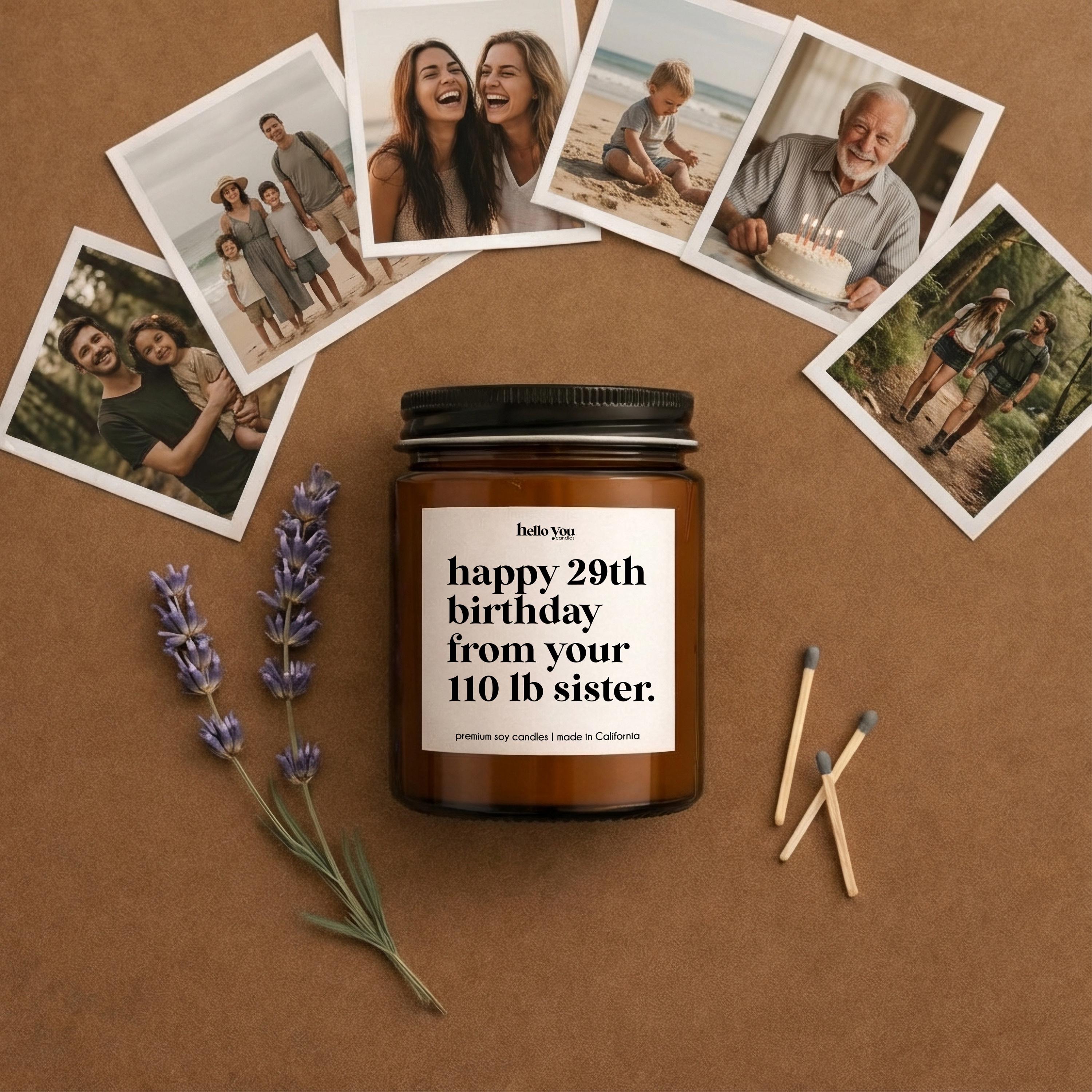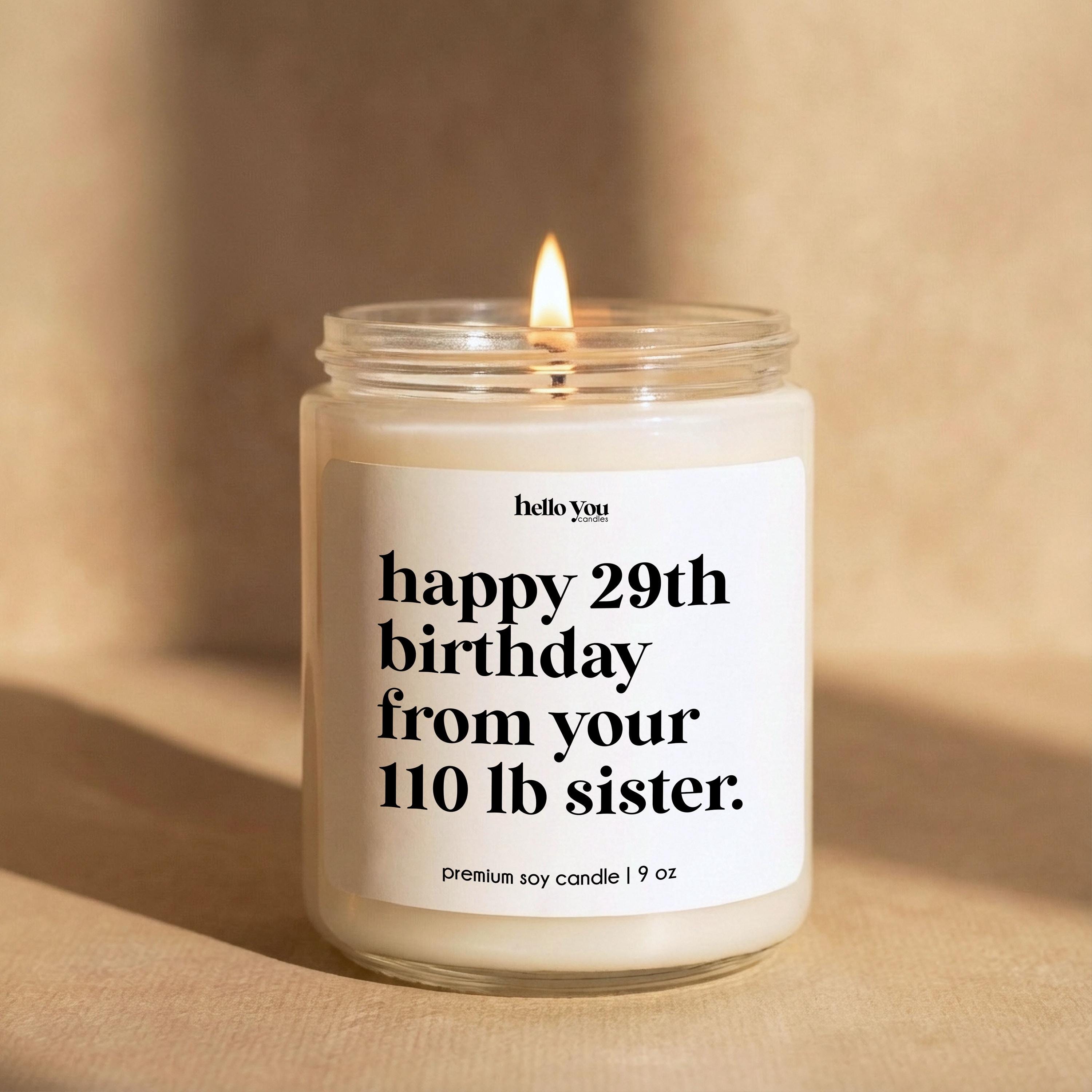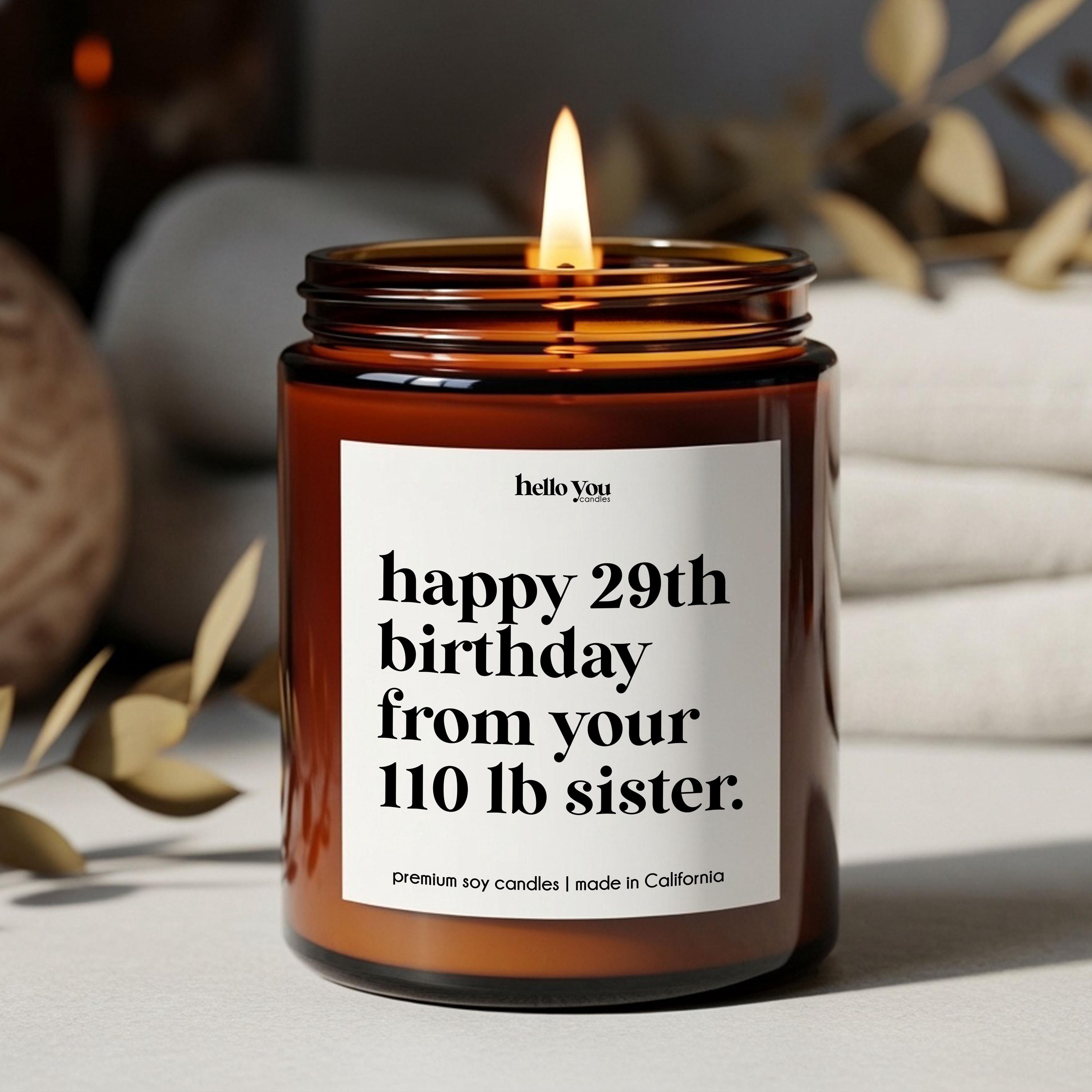 Our Sister Gifts Candles reads "Happy 29th birthday from your 110 lb. sister" and is the perfect best friend gifts, funny birthday gifts, funny candles, personalized candles, personalized gifts, funny birthday cards.