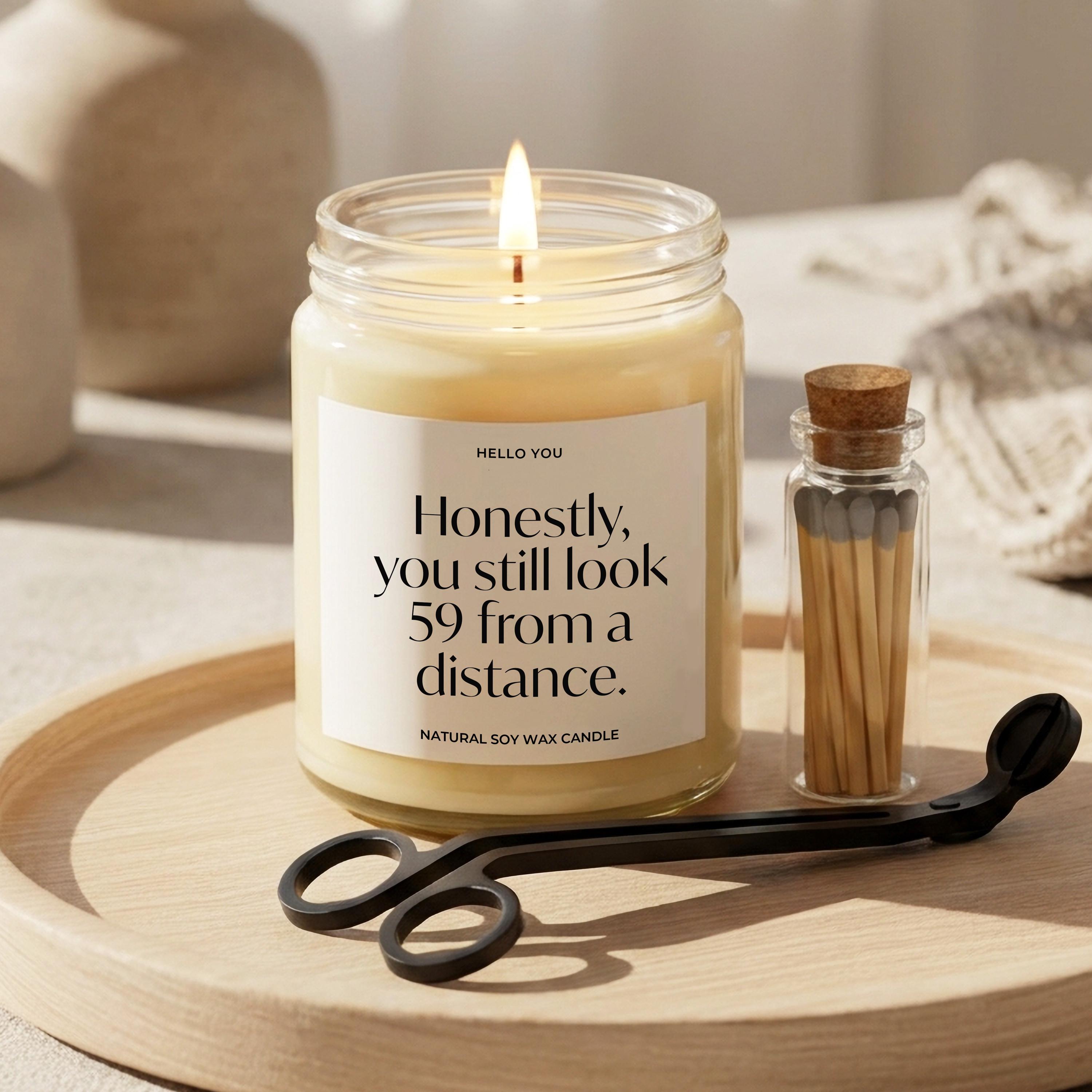Hi, welcome to Hello You Candles! Our Funny 60th Birthday Gifts for Women or 60th Birthday Gifts for Men Candle reads "Honestly you still look 59 from a distance" and are the perfect gifts for Best Friend 60th Birthday Gifts You still look 59 Funny Birthday Gift Candle, Milestone Birthday, Gifts for 60th Birthday Card Alternative
