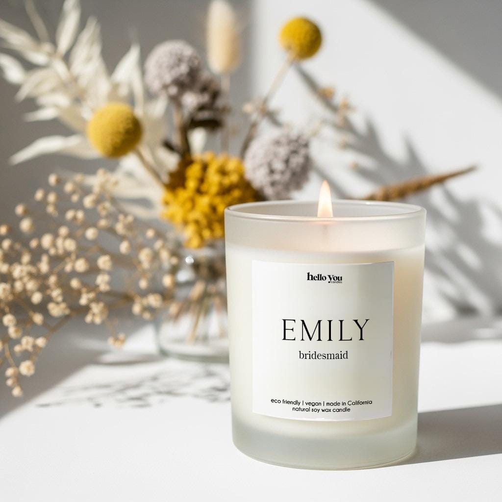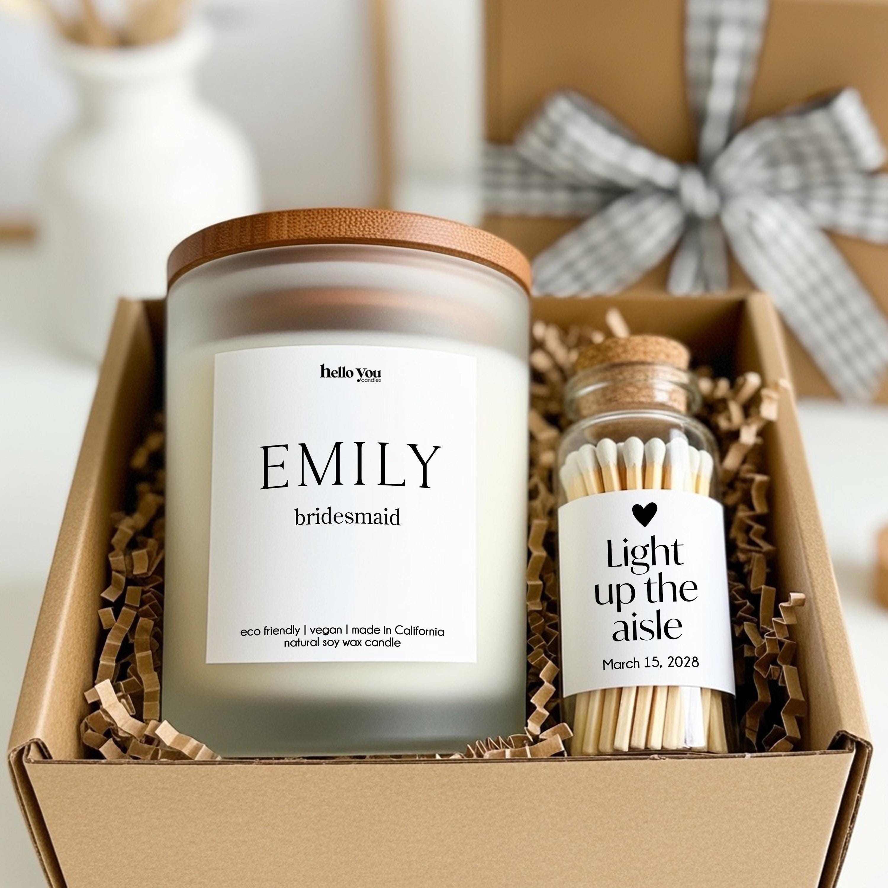 Ask your best girls in style with our Bridesmaid Candle and Match Gift Set! The candle labels are personalized with the Name and bridal party role and the Light up the aisle matches are personalized with the date of your big day. This charming set makes the perfect Bridesmaid Box or Proposal Box, and a sweet Bridesmaid Card Alternative for popping the question in a more personal way. Each candle is beautifully packaged and has the option to add the coordinating match set — a thoughtful touch for your Maid of Honor Proposal or Bridesmaid Gift Box. A keepsake they’ll love long after you say “I do.” 💍✨