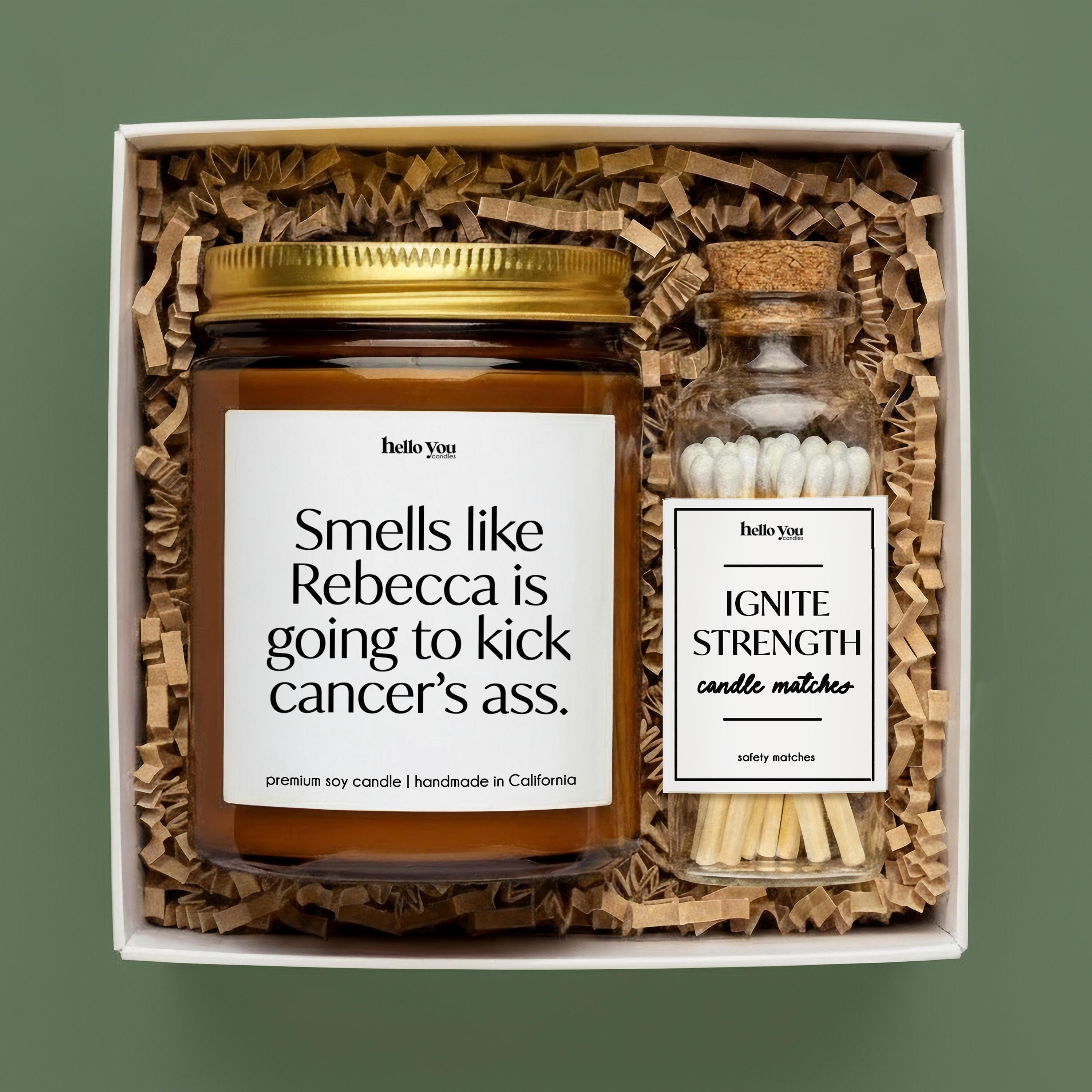 Our Cancer Gift Candle reads "Smells like name is going to kick cancer's ass" and is the perfect Cancer Patient Gift, Gift for Breast Cancer Patient, Chemo Care Package, Funny Candle, or Cheer Up Gift for Chemo.