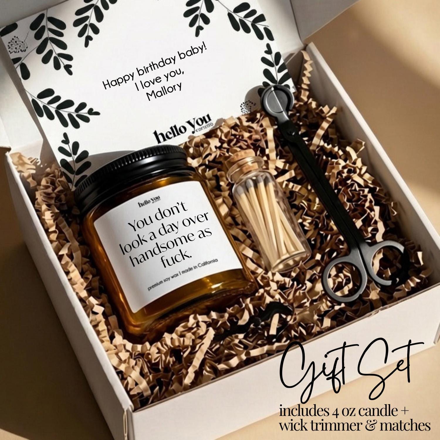 Our birthday gift for him candle reads "You don't look a day over handsome as fuck" and is the perfect birthday gift for husband, gift for your brother, boyfriend gift or gift for son.