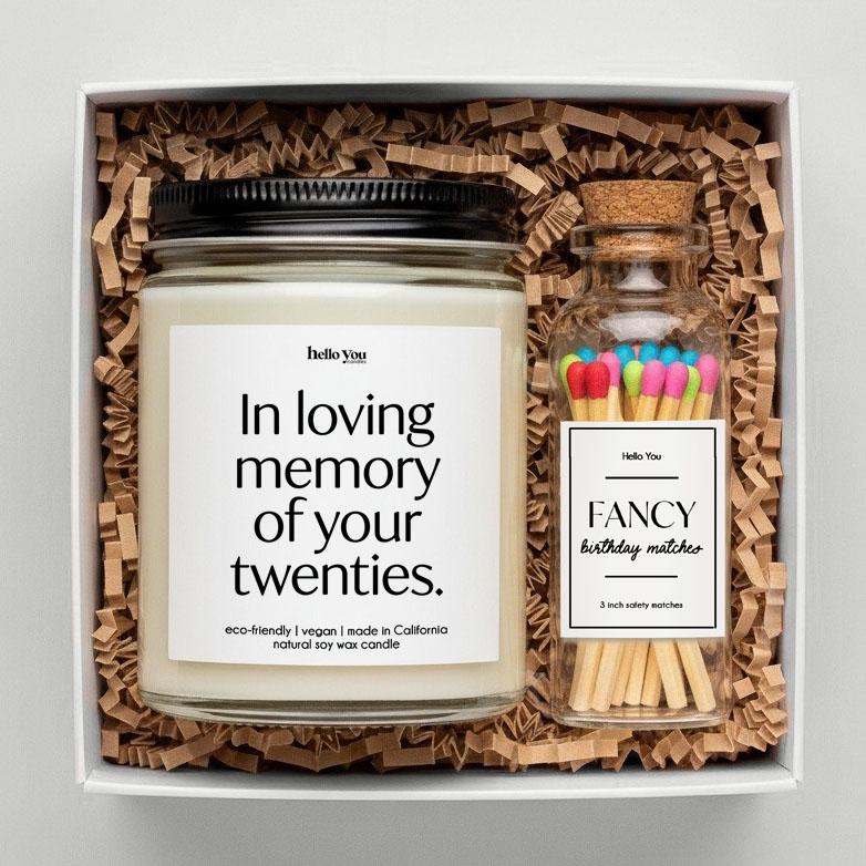 Hi, welcome to Hello You Candles! Our Funny 30th Birthday Gift Candle reads "In loving memory of your twenties." and are the perfect gifts for Best Friend 30th Birthday Gifts Funny Birthday Gift Candle Milestone Birthday Gifts for 30th Birthday Card Alternative