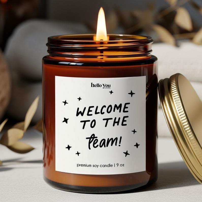 Hi, welcome to Hello You Candles! Our new team member gift candle reads "Welcome to the team" and is the perfect gift for New Team Member Gift, Best Team Candle, Corporate Gift, Team Appreciation, Coworker Gift or Employee Thank You Gift.