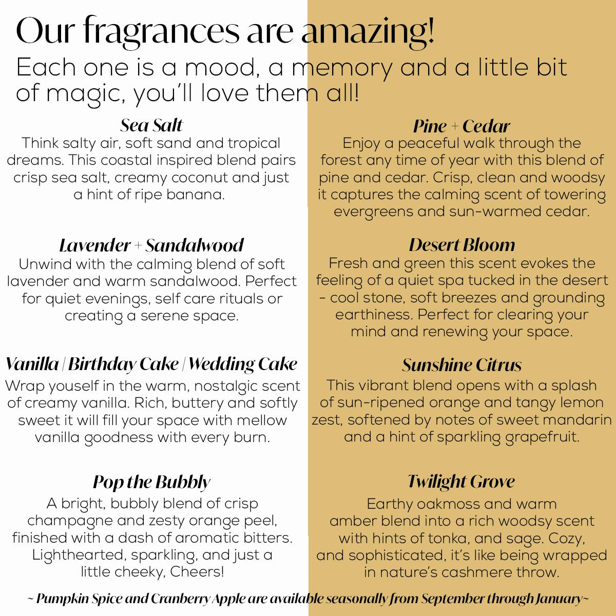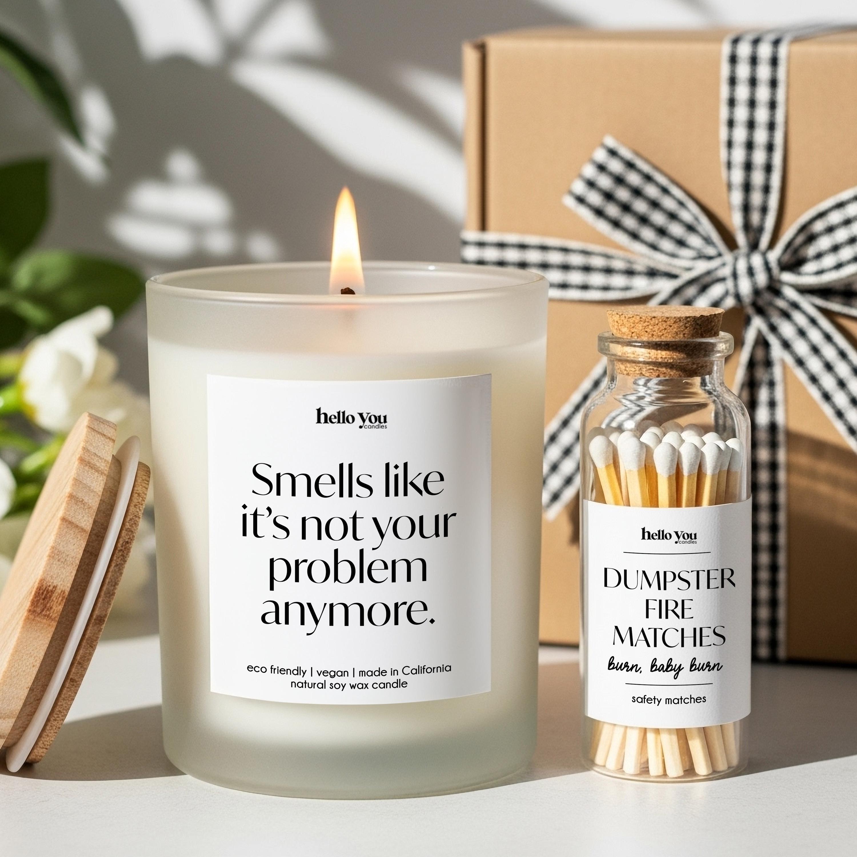 Choose from: 2.75 oz Soy Wax Melts, 10 oz Soy Candle, or 10 oz Soy Candle with Bottle of Matches Gift Set (approximately 30 3-inch matches).