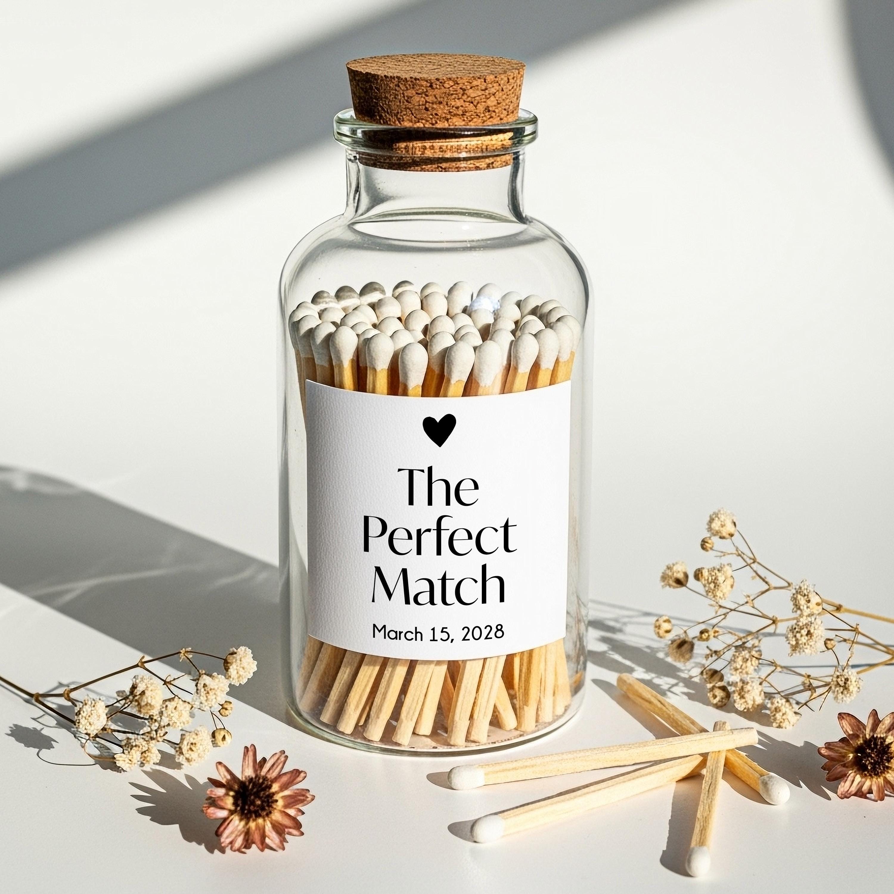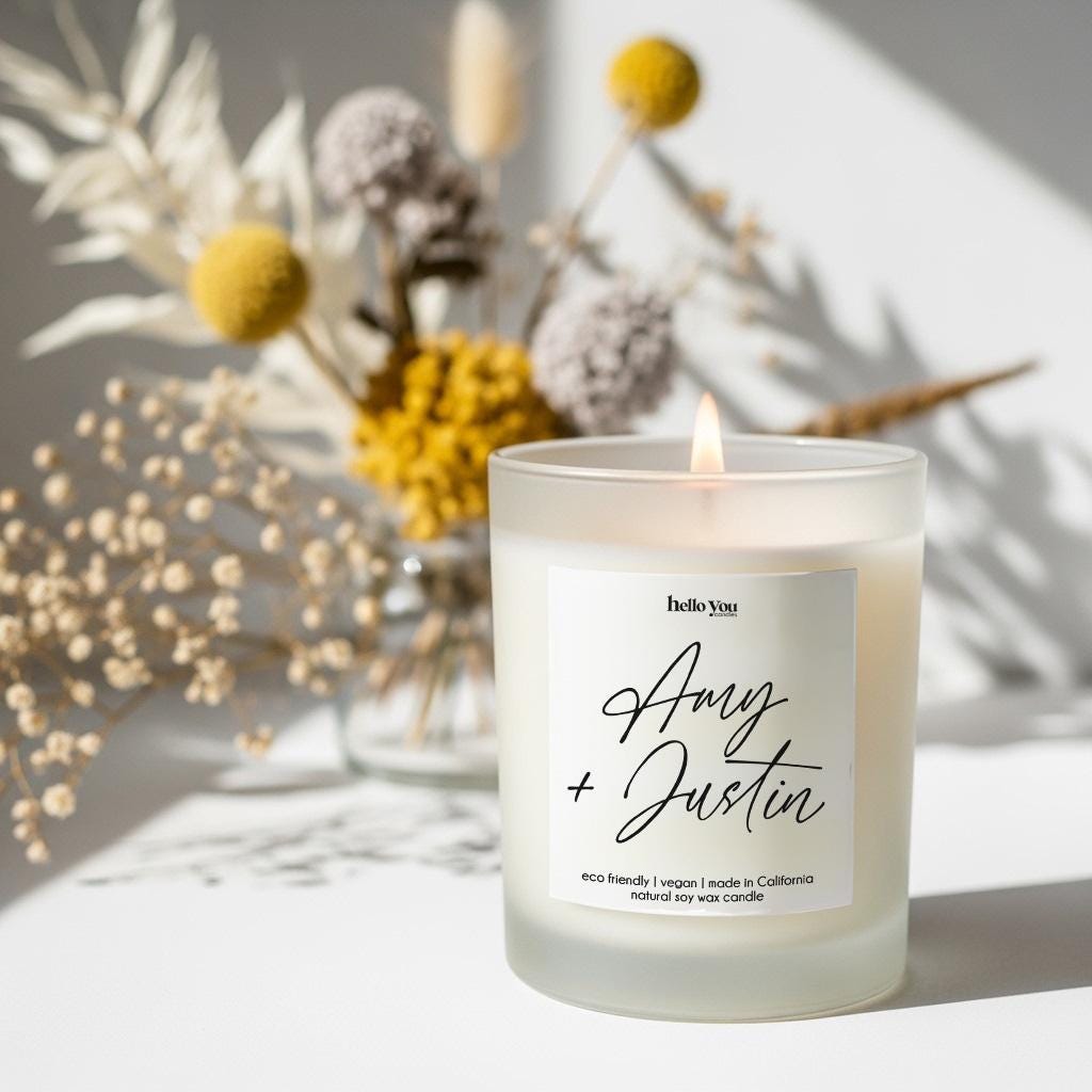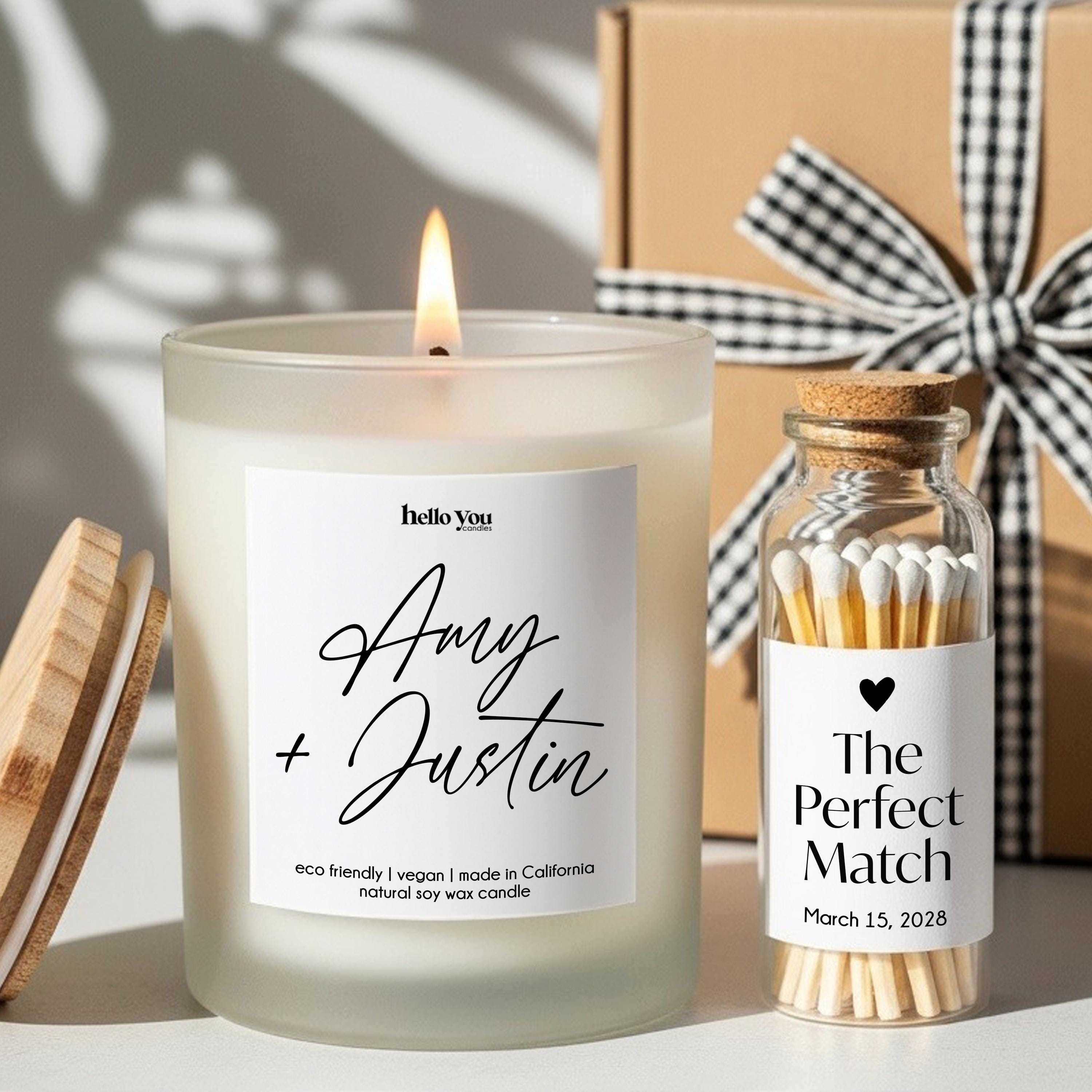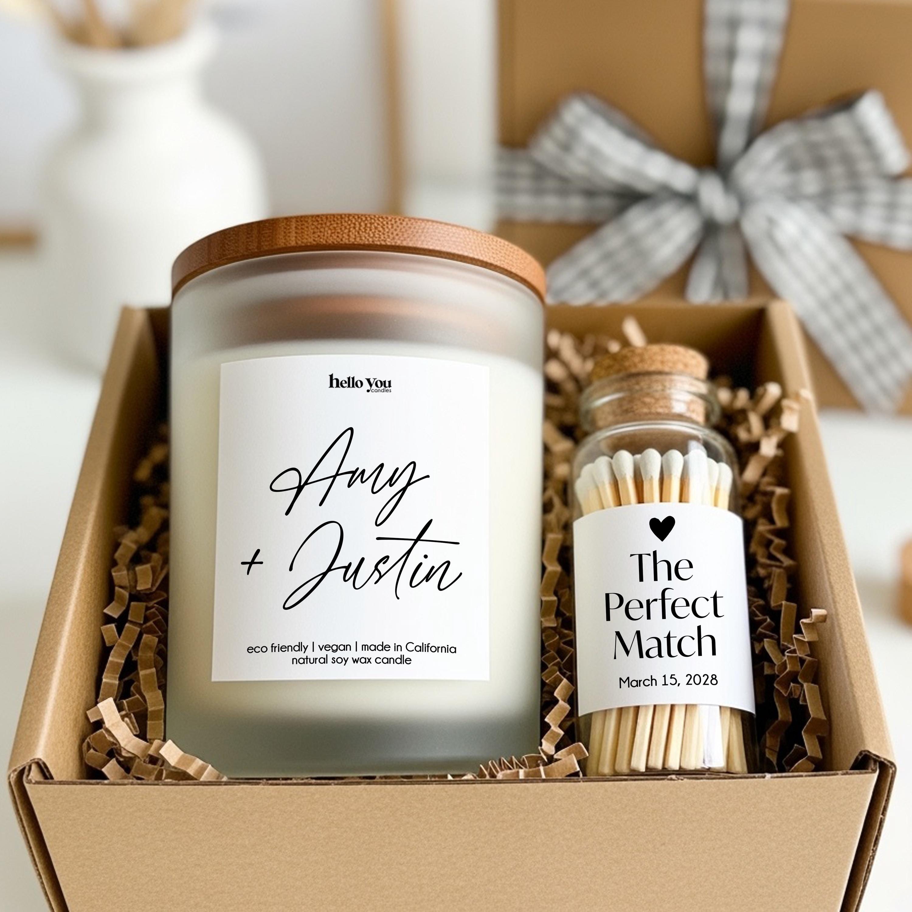 Our engagement candle is personalized with the names of the newly engaged gift names and is the perfect anchor to our engagement gift box. The personalized candle labels create the perfect custom engagement present with its engagement gift for couple unique designs and the perfect match custom matches with date.