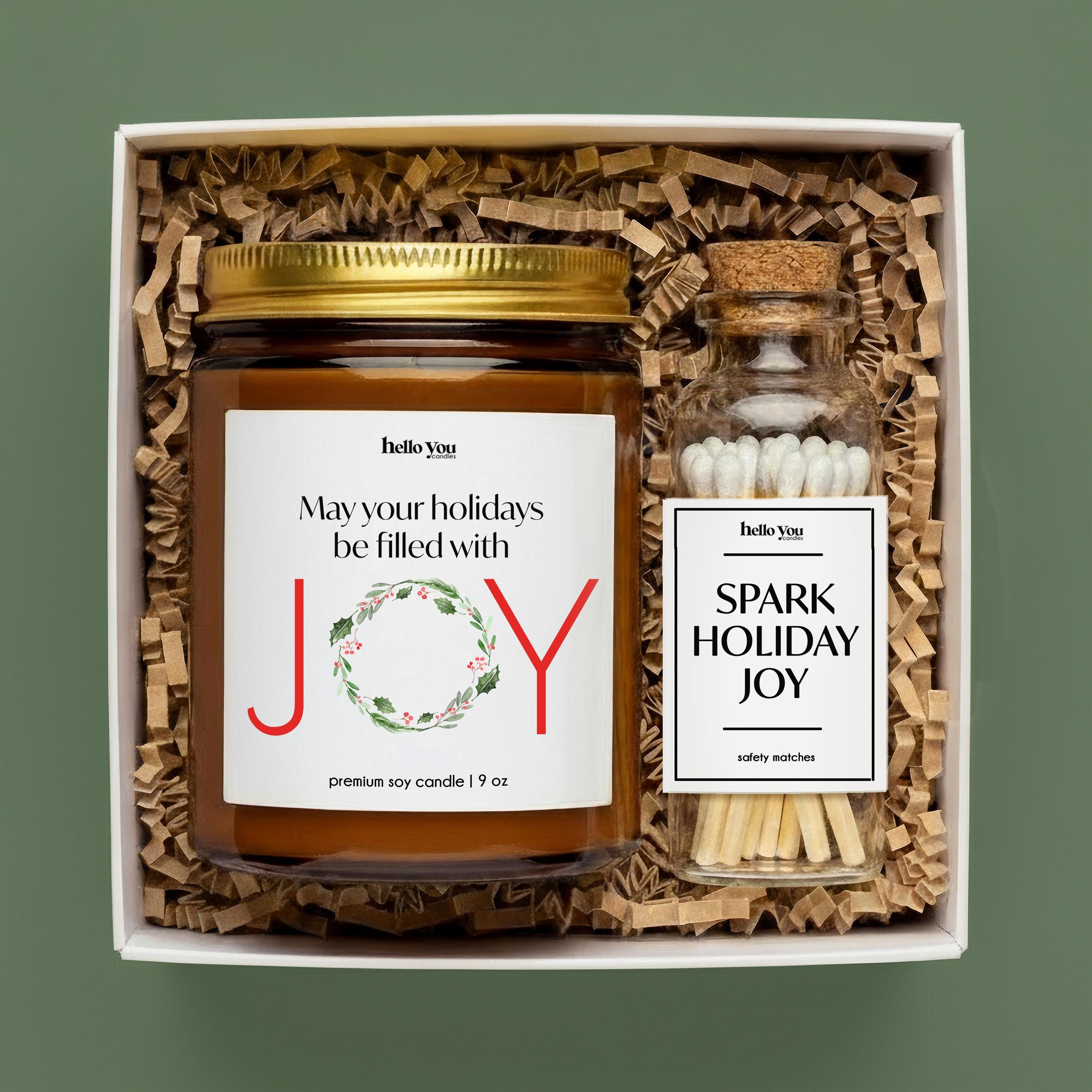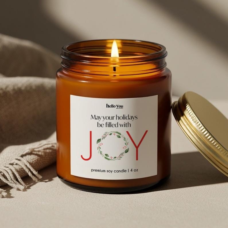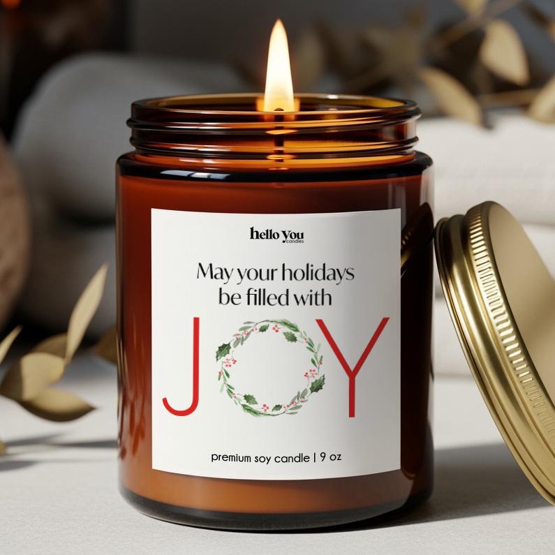 Our Personalized Client Gift Christmas candle reads "May your holidays be filled with Joy" and is the perfect Etsy Best Seller Christmas Gift, Christmas Neighbor Gift, Coworker Gift Christmas or Corporate Gift Christmas. Hello You Candles has the Best Selling Items on Etsy since 2015.