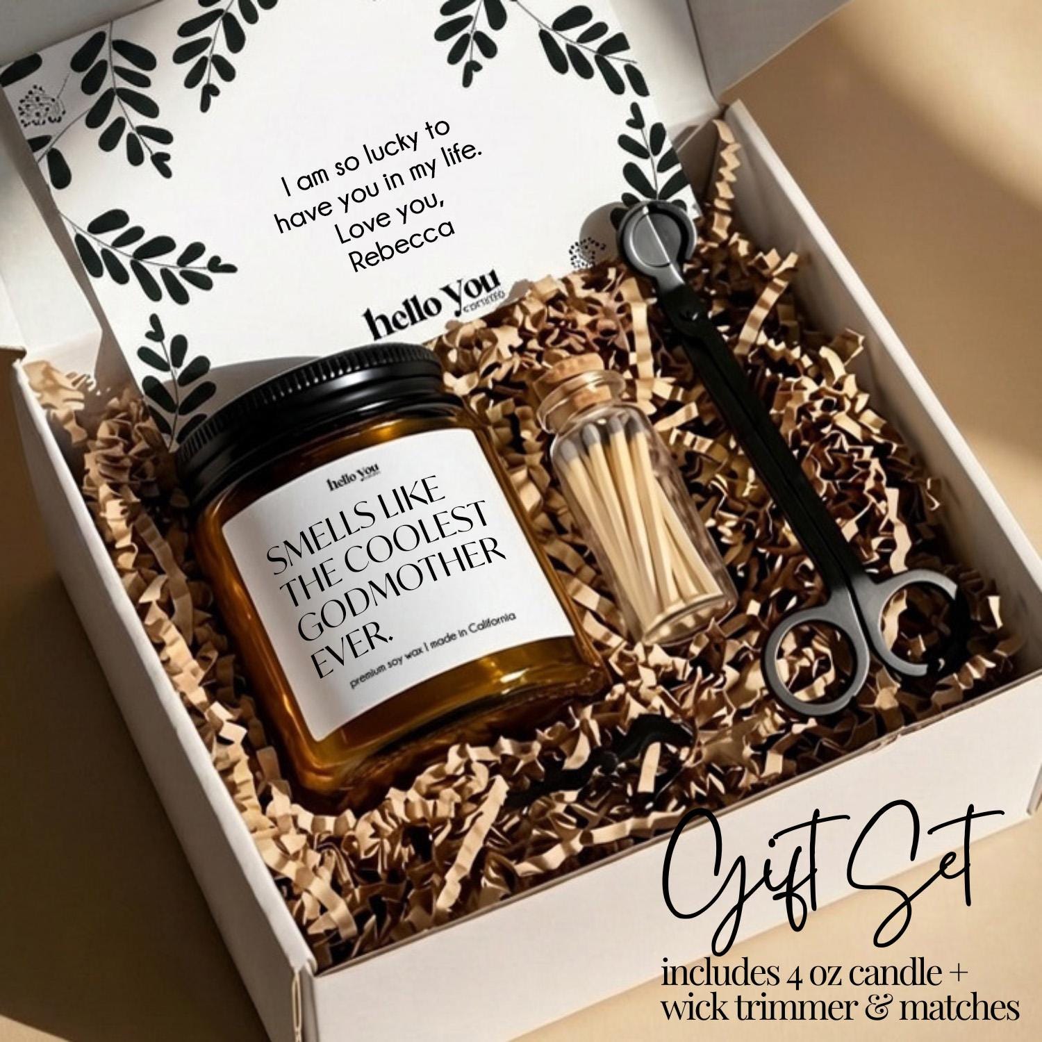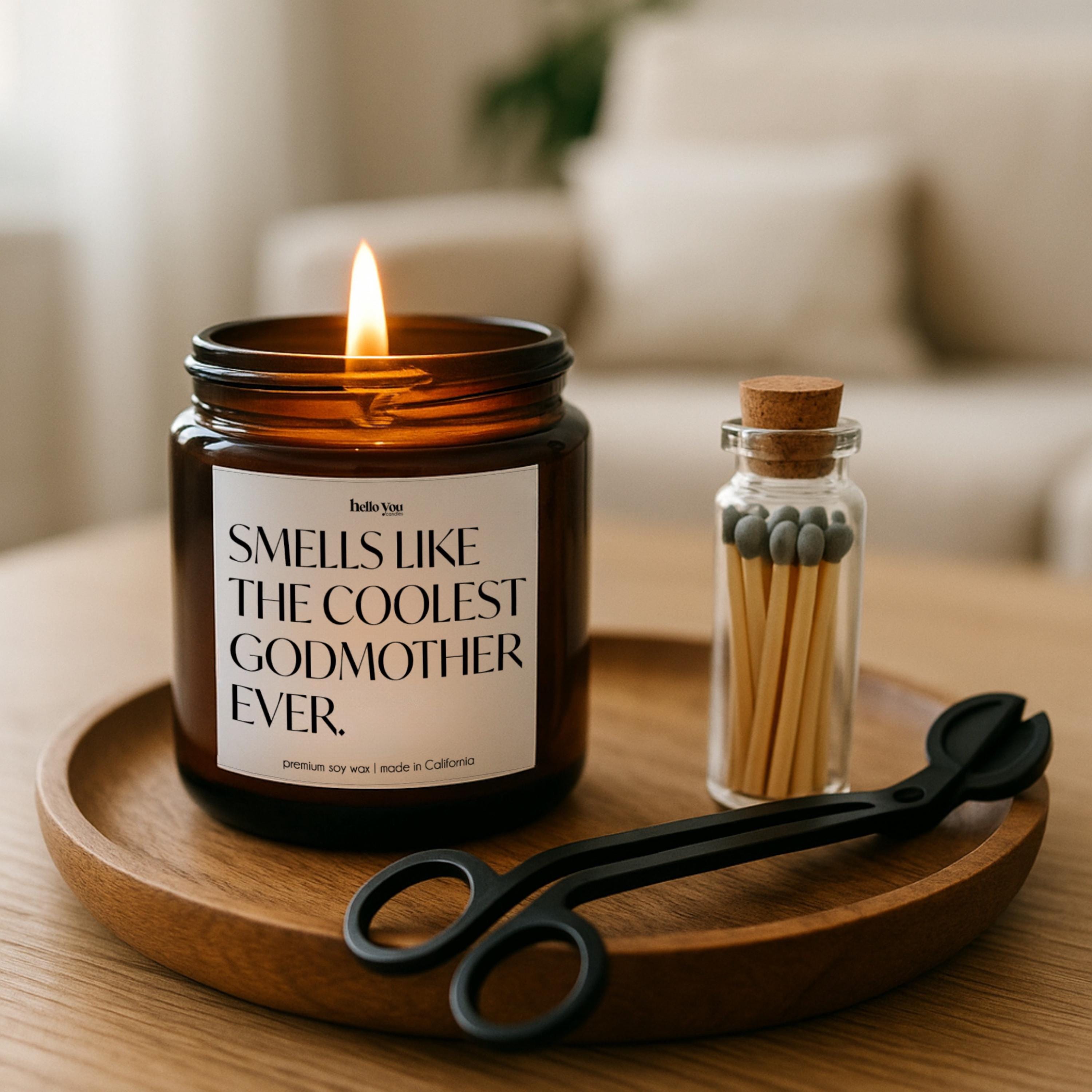 Celebrate the coolest godmother ever with this Godmother Gift Candle or Candle Care Gift Set, the perfect way to surprise her with a thoughtful, personalized touch. Our “Smells Like the Coolest Godmother Ever” candle is hand-poured in our California studio using 100% soy wax and clean ingredients, making it a heartfelt standout among gifts for Godmother, Godmother gift, and God mother gift ideas. Paired with a stylish wick trimmer and aesthetic match set, this bundle makes a beautiful Godparent gift, a sweet Godmother proposal, or even a creative alternative to traditional Godparent proposal cards. Whether you're celebrating a new role, adding to your list of Godparents proposal surprises, or simply treating the best bonus parent ever, this candle care gift set brings warmth, meaning, and a little sparkle to your favorite Godmother’s day.