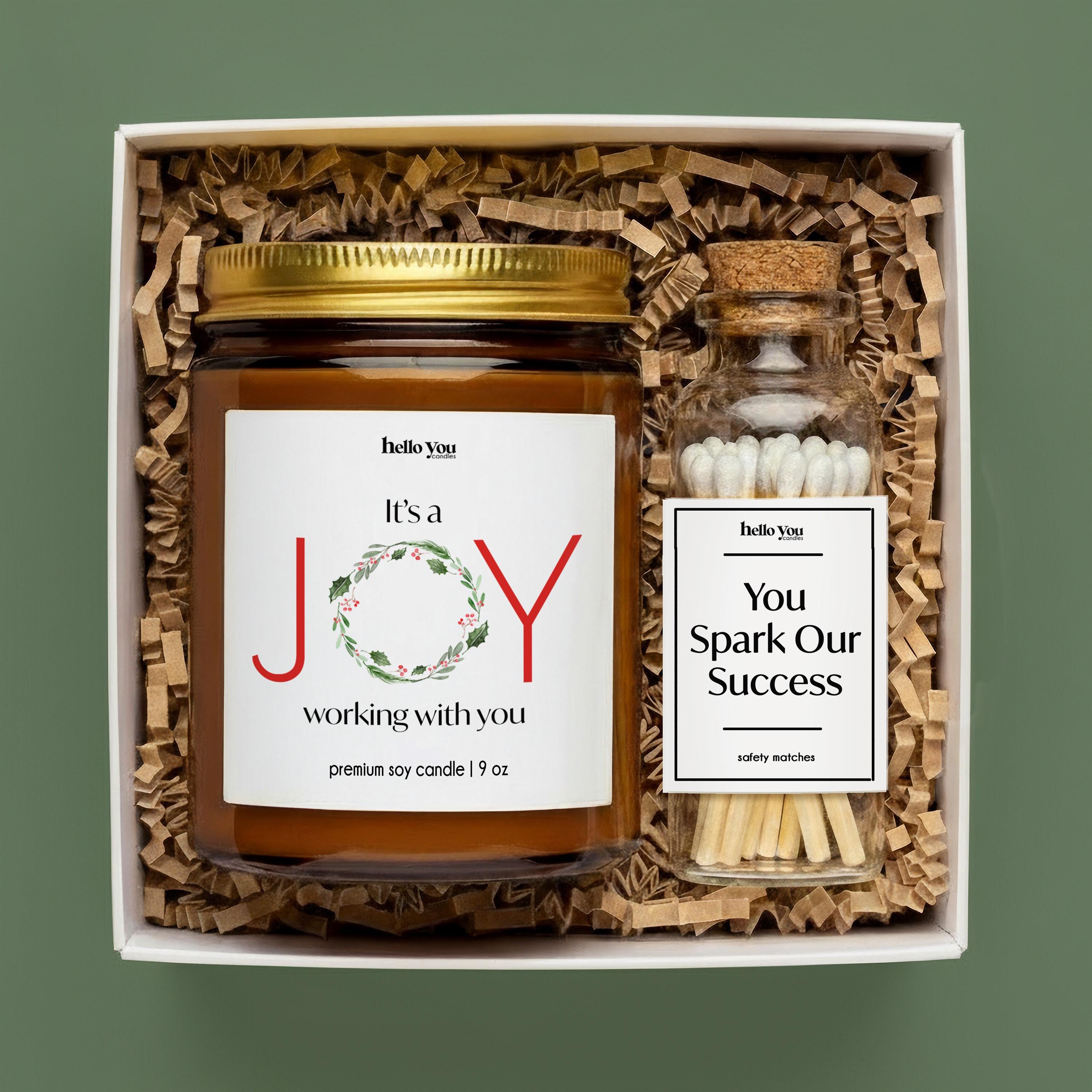 Hi, welcome to Hello You Candles! Our Client Gift Candle reads "It's a Joy working with you" and is the perfect gift for Client, Client Christmas Gifts, Realtor Client Gift or Salon Client Gift Bulk Christmas Gift Candles.
