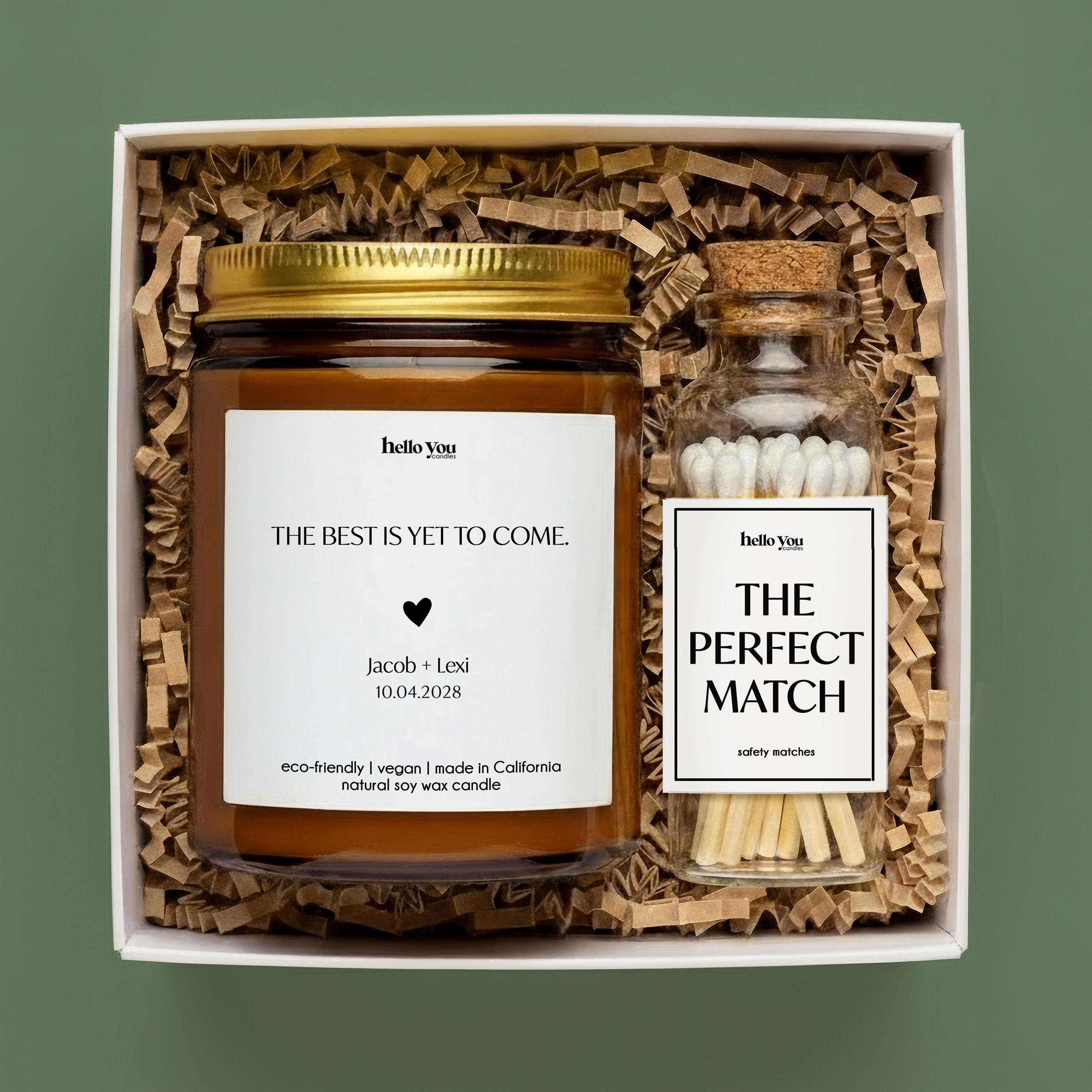 Celebrate their love story with a stunning Personalized Newly Engaged Gift for Couple. Our “The Best Is Yet To Come” candle is custom-printed with the couple’s names and wedding date, making it a beautiful keepsake they’ll treasure long after the celebration ends.