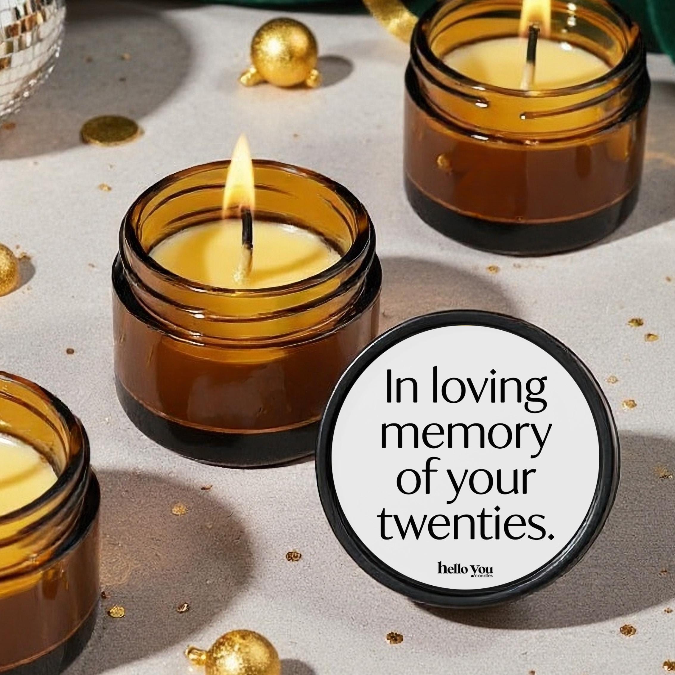 Our Funny 30th birthday gift candles is the perfect way to say goodbye to the wild twenties and hello to a brand-new decade with our “In Loving Memory of Your Twenties” candle — the perfect Funny Birthday Gift for anyone stepping into their thirties with humor (and maybe just a tiny bit of denial). This Funny Candle makes a crowd-pleasing 30th Birthday Gift, whether you're shopping for a Best Friend 30th, coworker, sister, or anyone who appreciates a good laugh.