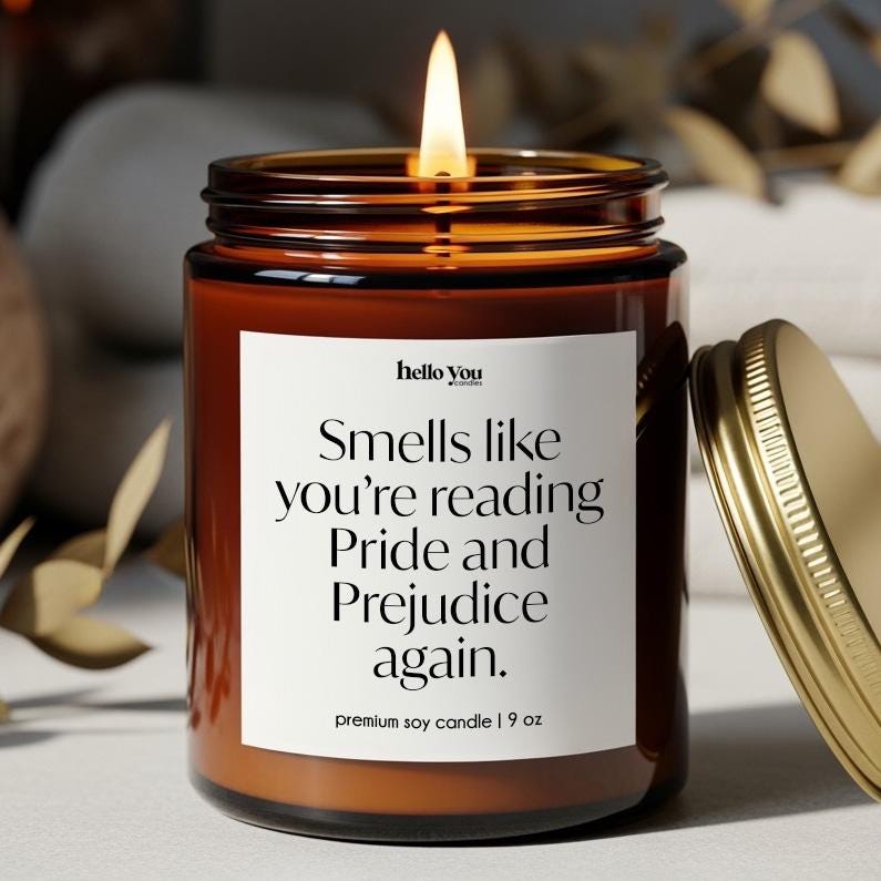 Step back into the world of Mr. Darcy, swirling skirts, and slow-burn romance with our “Smells Like You’re Reading Pride and Prejudice Again” Candle. This literary-inspired soy candle is the perfect gift for book lovers, Jane Austen fans, cottage core readers, and anyone who wishes they could experience their favorite classic for the first time all over again. Hand-poured in sunny California using 100% American-grown soy wax and clean, phthalate-free fragrance oils, this non-toxic candle fills your space with a warm, bookish glow—making it the ultimate companion for re-reading, annotating, or daydreaming about Mr. Darcy’s next line. A charming gift for birthdays, holidays, book club friends, cottage-cozy décor lovers, and your favorite Austen-obsessed bestie. Curl up, light it, and find yourself right back in the middle of Pemberley.