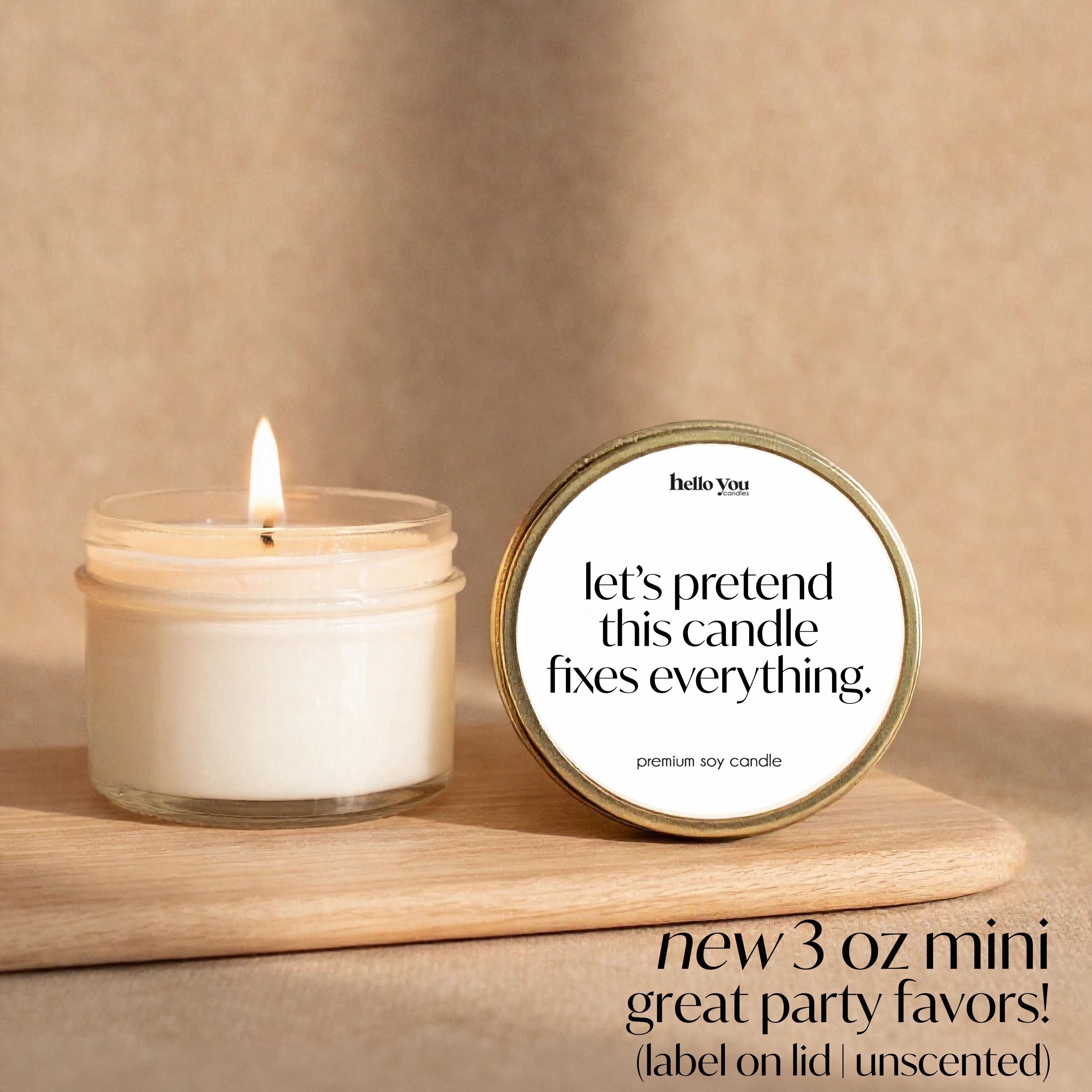 Let’s pretend this candle fixes everything — because honestly… it can’t, but it can make the day feel a little lighter. This funny candle is a cozy little dose of humor and comfort, perfect as a self care gift, emotional support candle, or “I’m thinking of you” pick-me-up when life is doing the most. Choose your size (including a mini unscented option) and upgrade to our self care gift box if you want it to arrive ready to give — complete with a small bottle of matches and a sleek black wick trimmer. Hand-poured with simple ingredients for a clean, cozy burn, this candle makes a great stress relief gift, care package, or funny gift for her (or anyone who needs a laugh and a little calm). Perfect for birthdays, rough weeks, breakups, coworker survival gifts, and every “send help” moment in between.