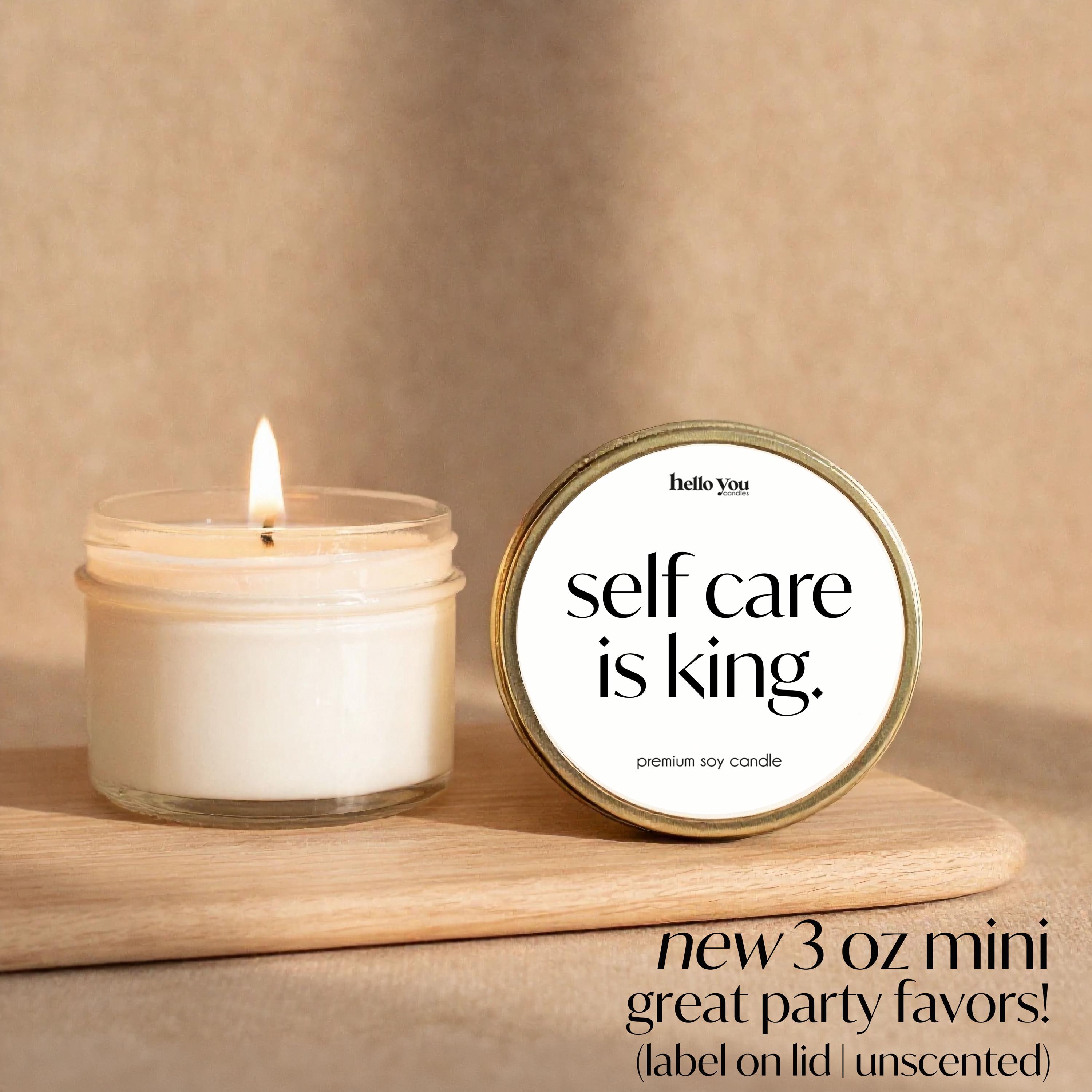Self care is king — and this candle is your tiny little reminder to act like it. Whether you’re reclaiming a quiet moment, resetting after a long day, or simply choosing peace over chaos, this funny self care candle brings comfort with a wink. It makes an easy self care gift, stress relief gift, or “I’m thinking of you” pick-me-up for anyone who needs a little calm (and a little attitude). Choose your size, including a mini unscented option, or upgrade to our self care gift box for a ready-to-gift set that includes a small glass bottle of matches and a sleek black metal wick trimmer. Hand-poured with simple ingredients for a clean, cozy burn, it’s perfect for birthdays, rough weeks, breakups, coworker survival gifts, and every “do not disturb” moment in between.
