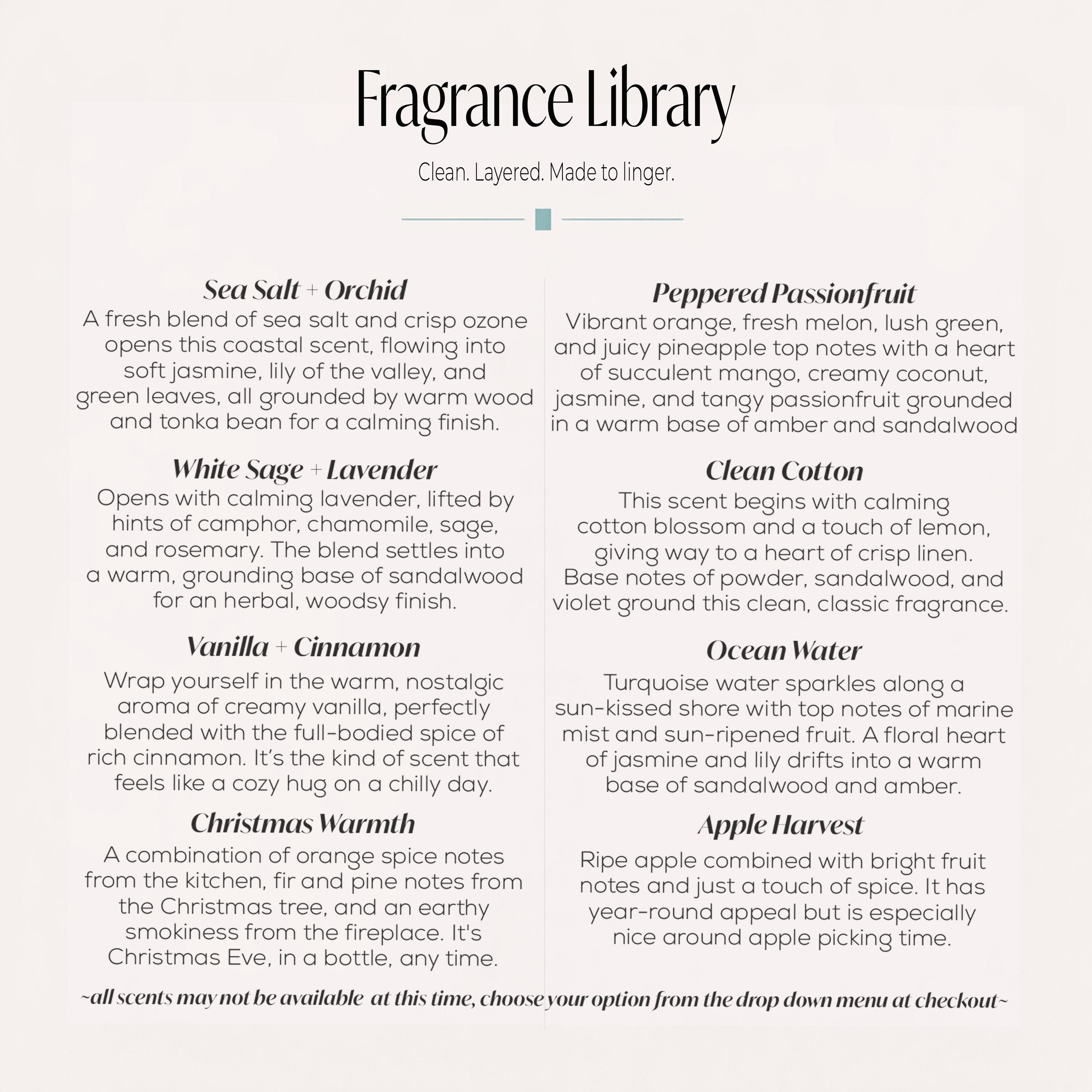 White Sage + Lavender is calming and aromatic blend balancing fresh herbal and warm notes.