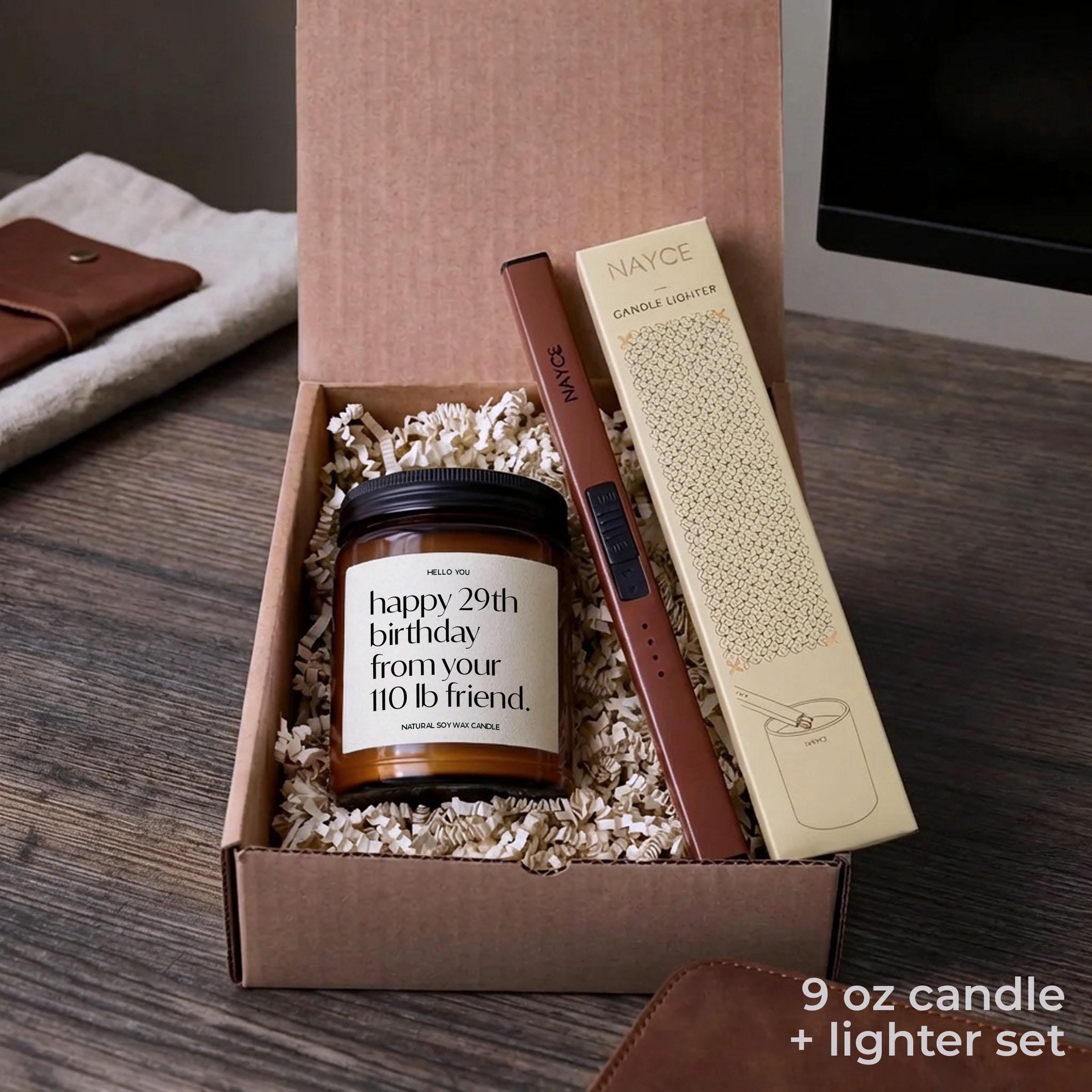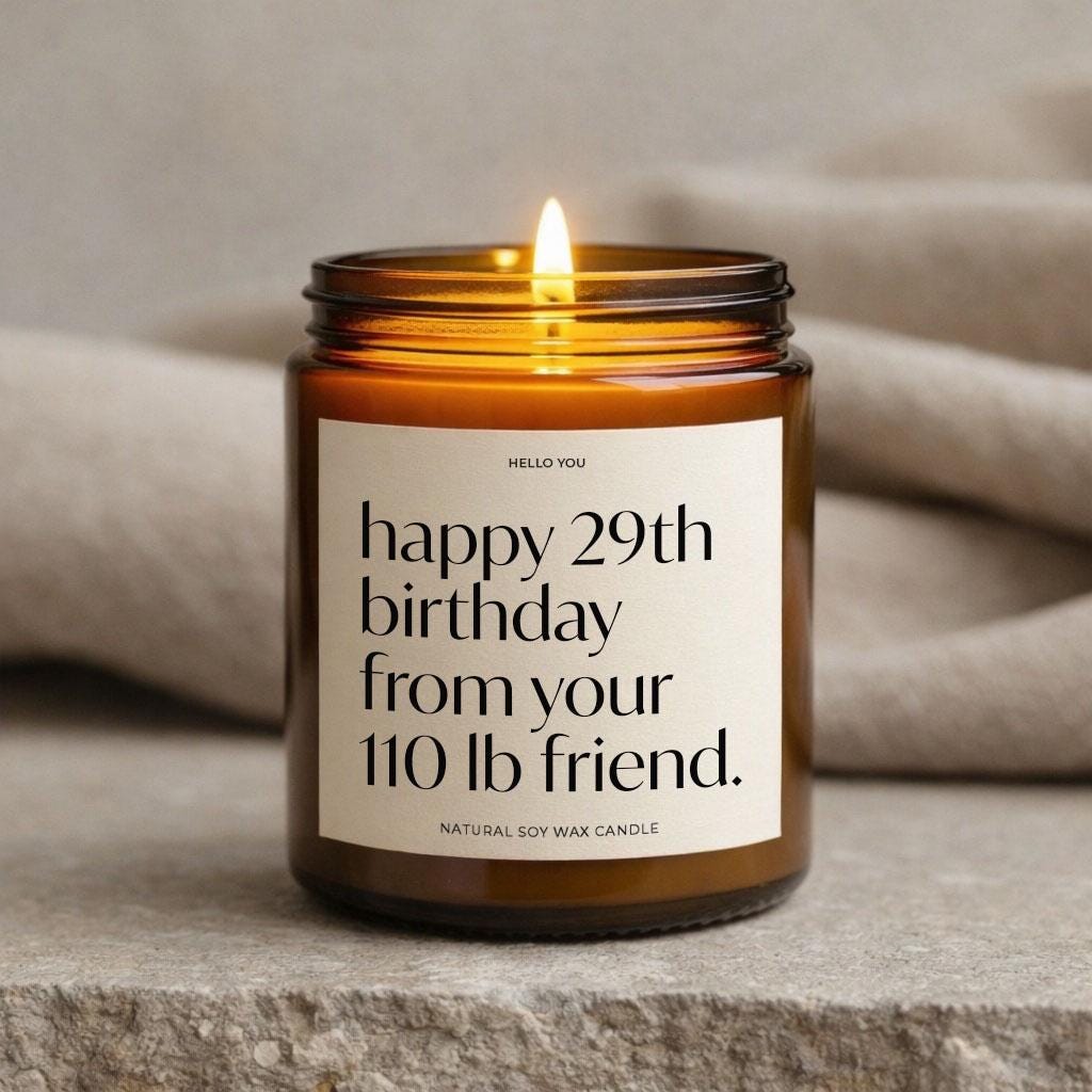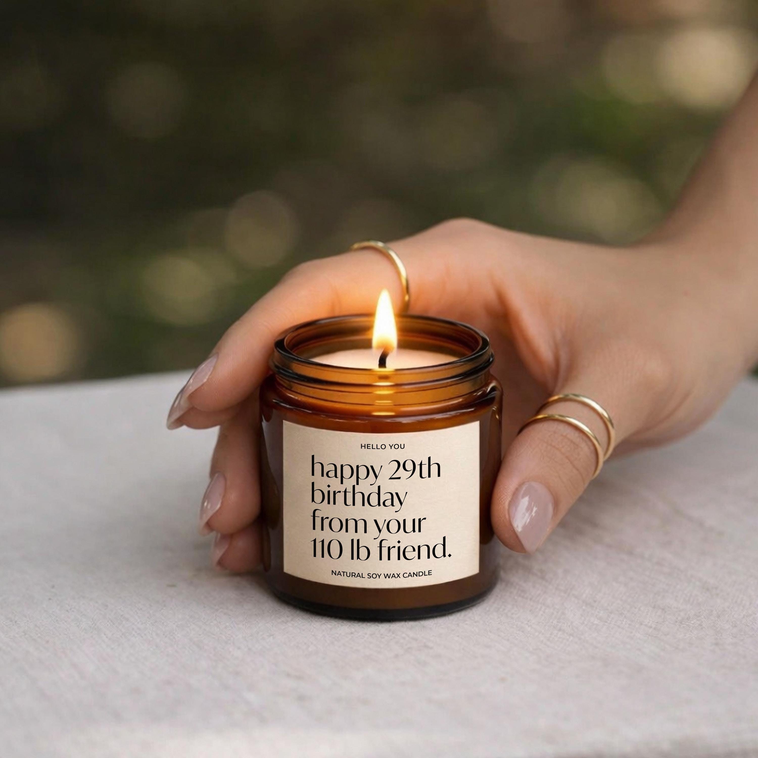 Our Best Friends Candles Birthday Gift is the perfect Bestie Candle or Friendship Gifts Candle reads "Happy 29th birthday from your 110 lb. friend" and is the perfect best friend gift birthday, funny birthday gifts, funny candles, personalized candles, personalized gifts, funny birthday cards.